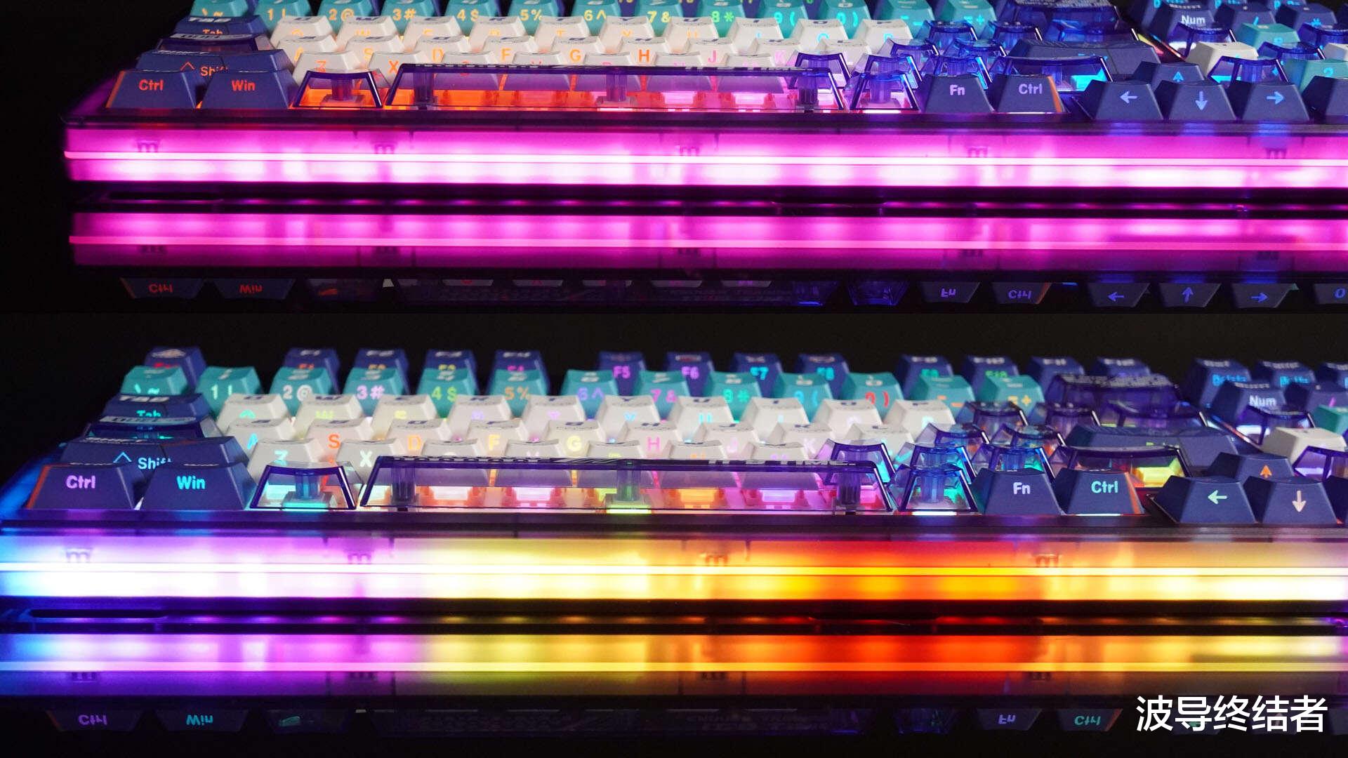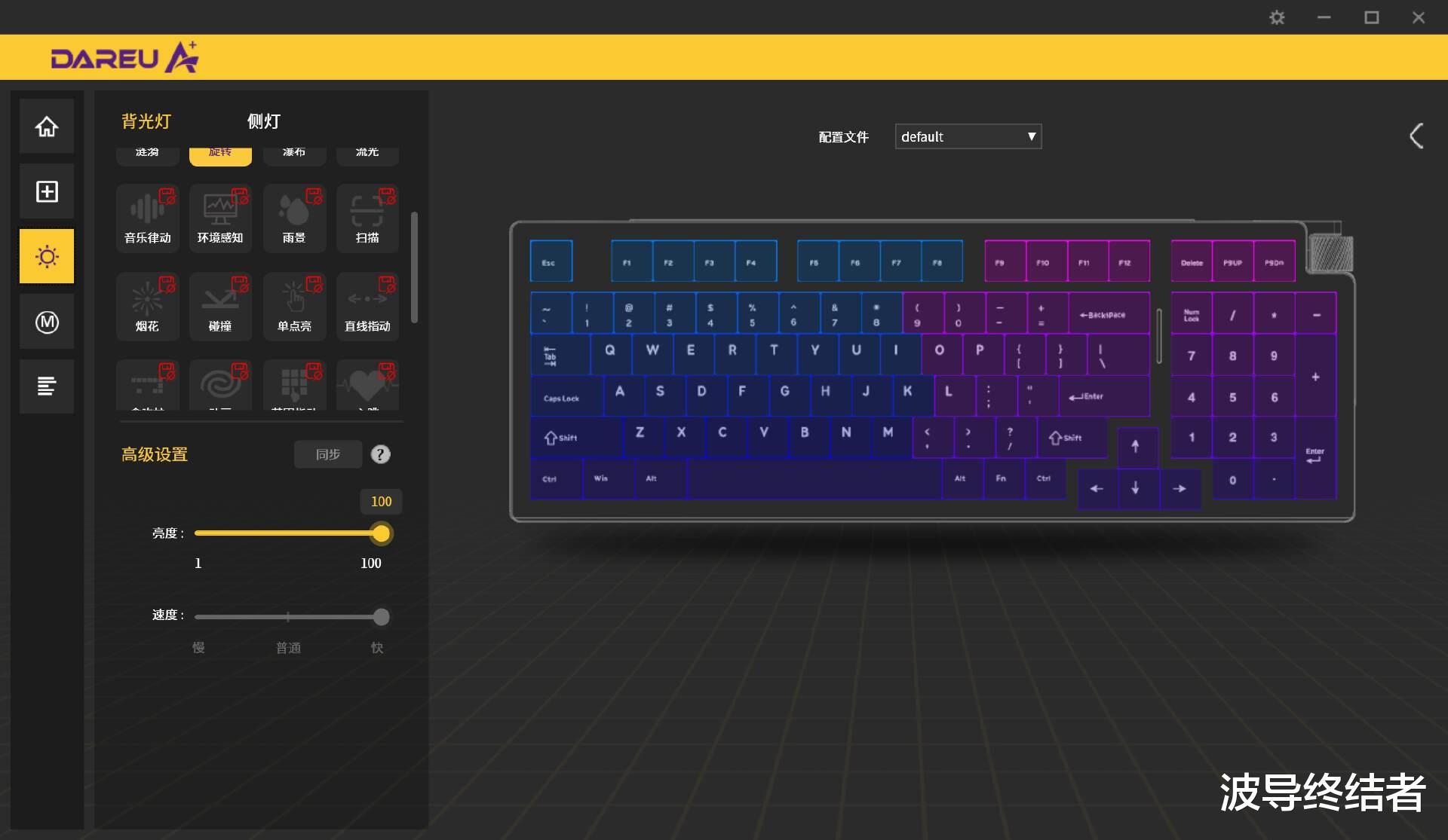 可以看到,侧面这个灯带的效果还是非常不错的。至于键盘主体的灯光设置,与传统的RGB键盘设置无异,我一般是设置为全彩旋转,速度最快,要不然岂不是浪费了这么好看的灯效哈哈。甚至在高级主设置里,还可以开启音乐律动,颜色感知等高级光效,这个就看各人喜好了。