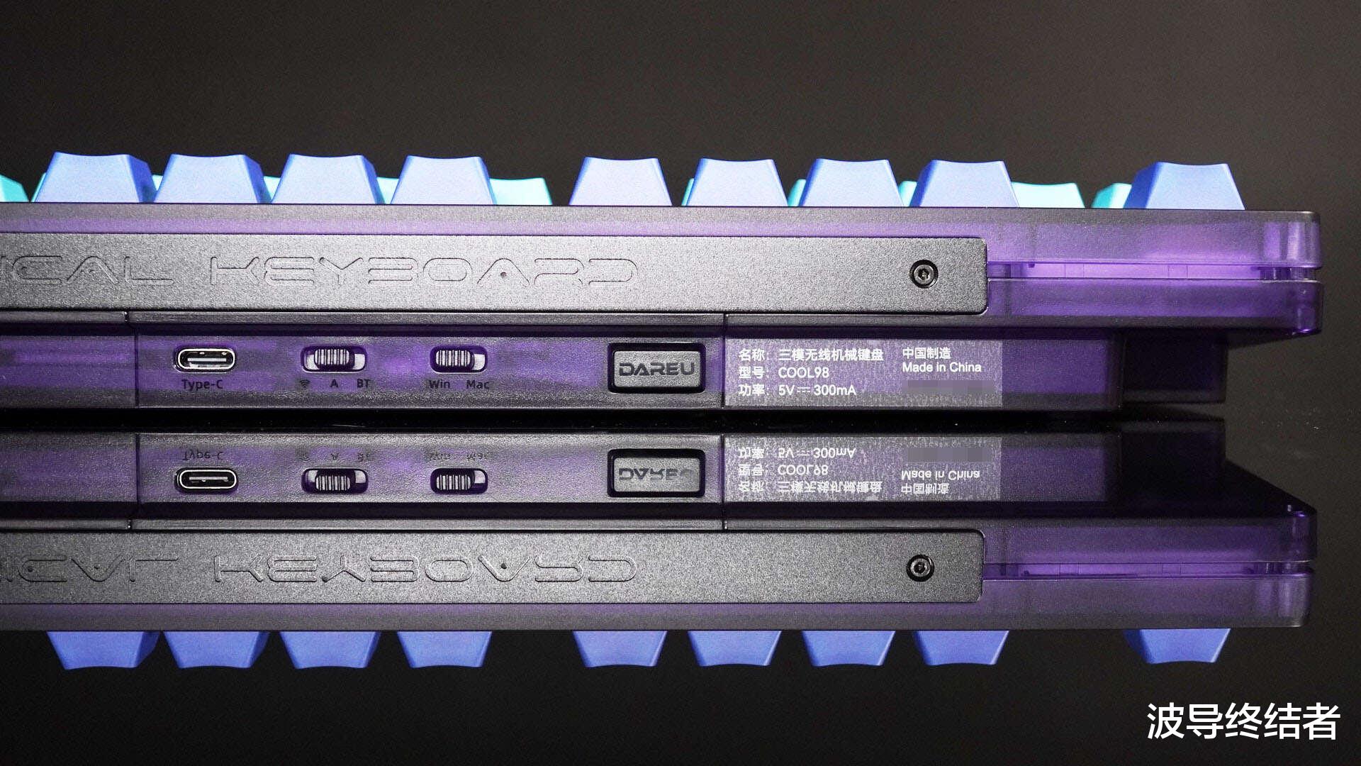 达尔优COOL98搭载了8000mAh的锂电池,关闭灯效的话一个月一充轻轻松松。侧面四周都有阳极氧化金属件,增加整体强度和耐用性。顶面是Type-C接口,三模切换开关,WIN/MAC布局切换开关,以及2.4G适配器的收纳仓。