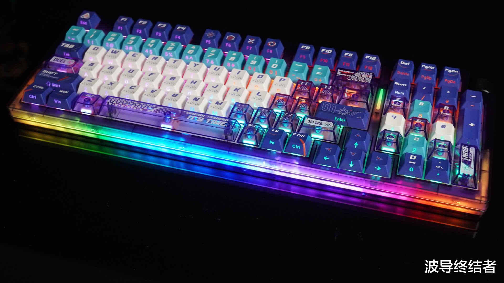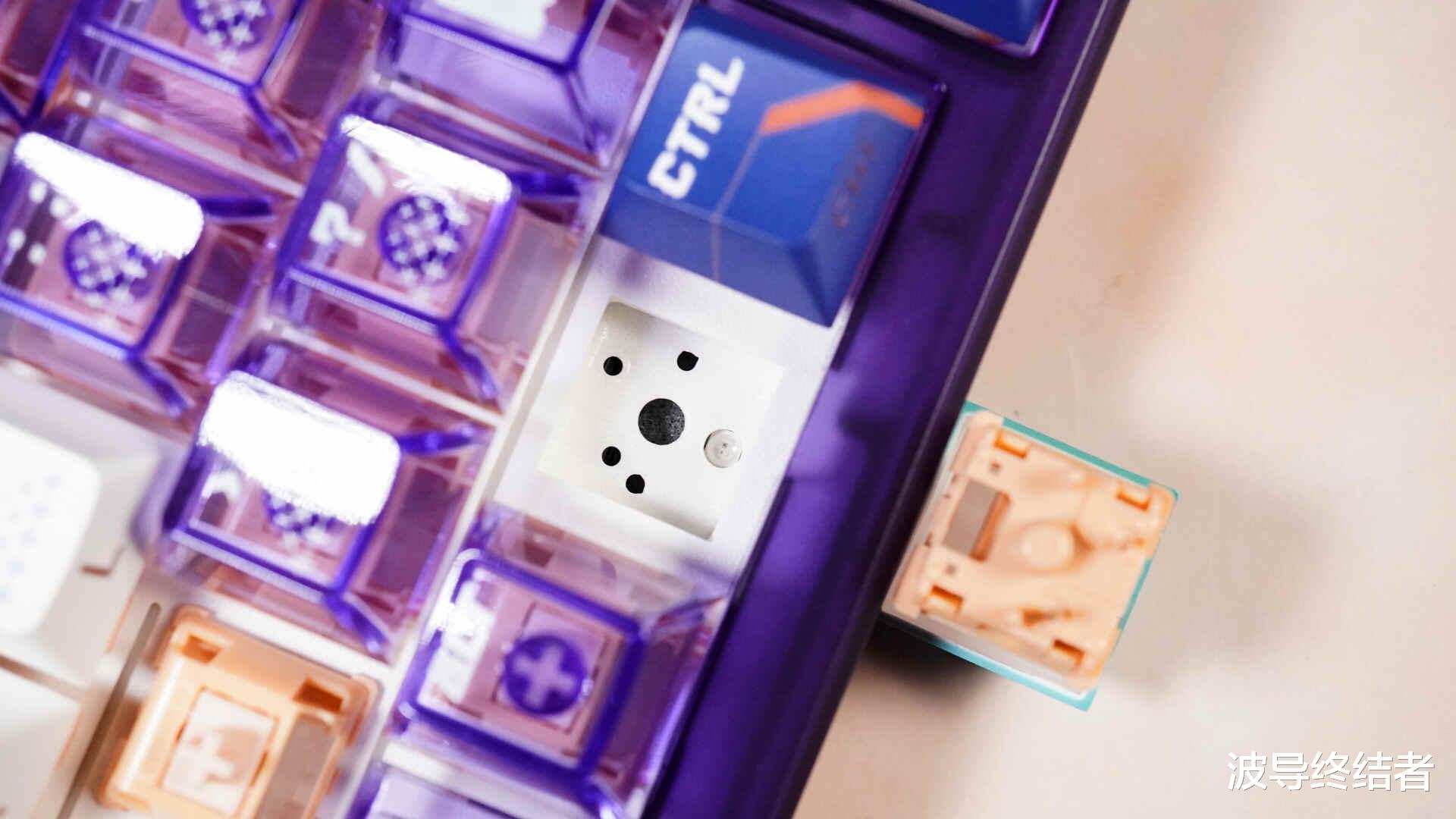 键帽方面,这款动力紫采用了很好看的拼色设计,透明键帽为PC材质,透光度和耐用性都很不错。其他键帽则是PBT材质,部分还有侧刻字样,也是很下本了。
