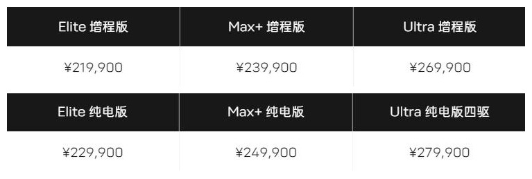 此外,Elite 后驱增程版 39.05kWh)和(Max+ 后驱增程版 39.05kWh)可选装(52.01度电池组);(Ultra 后驱增程版 52.01kWh)可选装(前后双电机动力系统)。