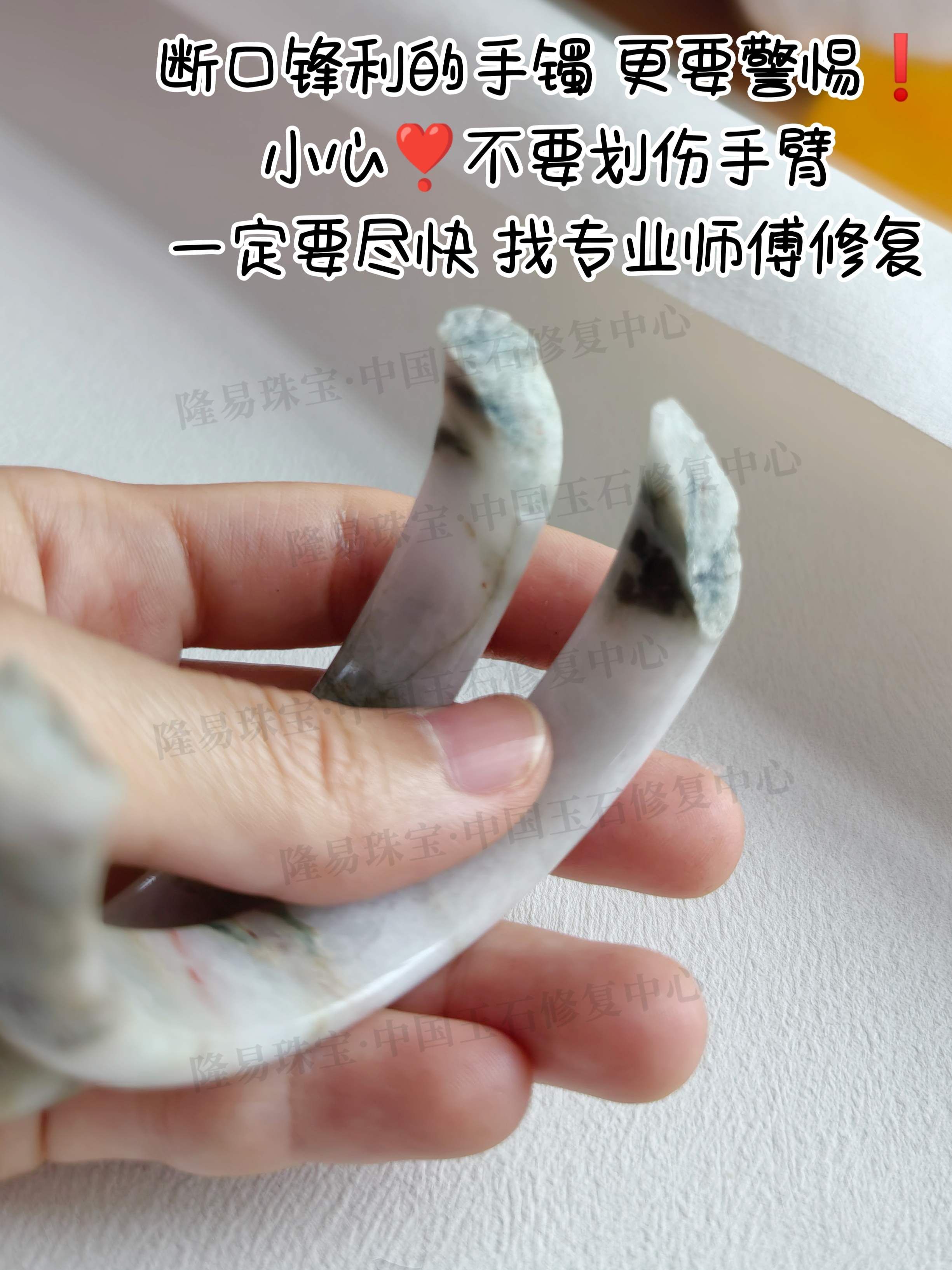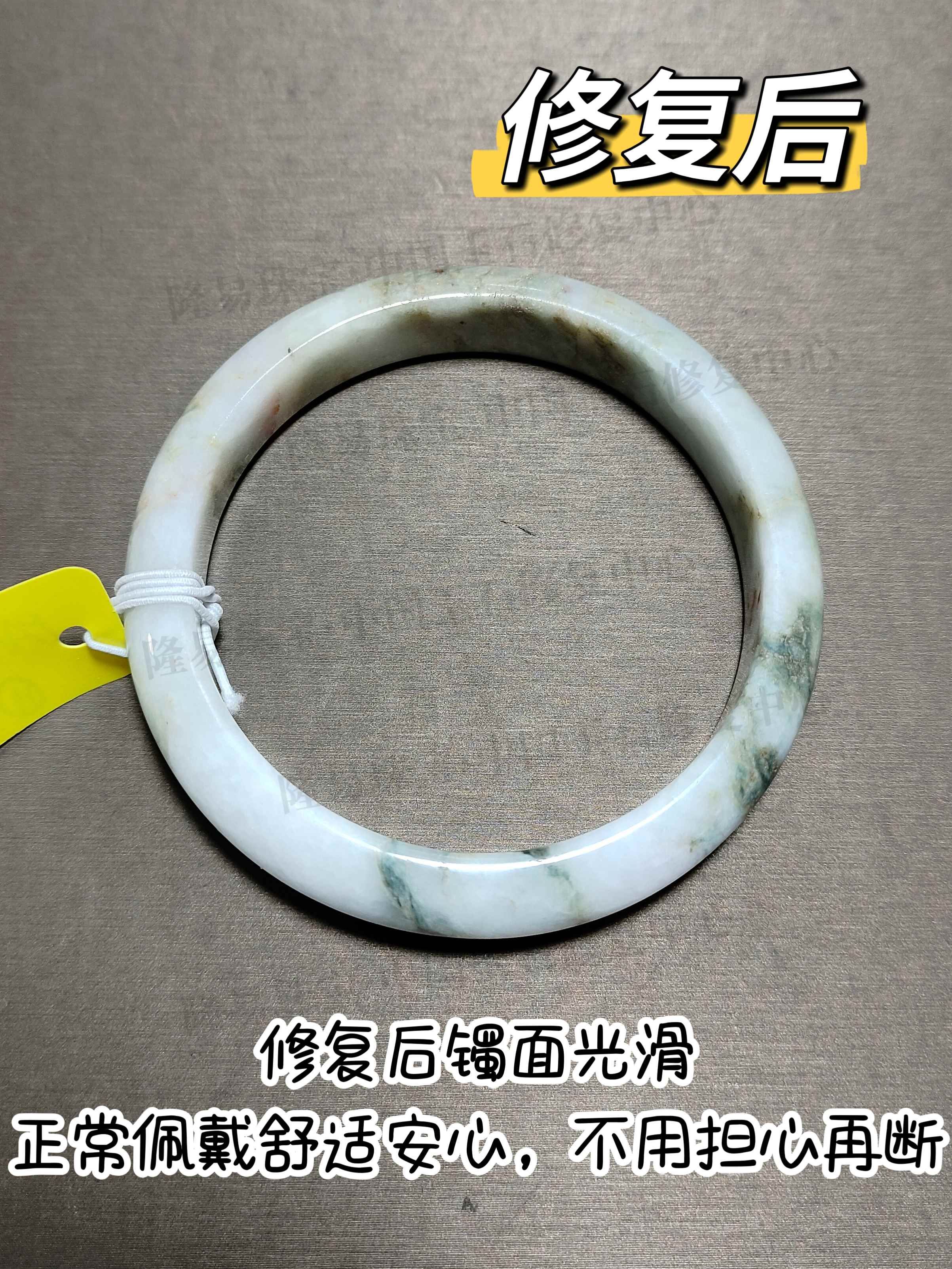 咱们可以通过玉石粉填充进行修复补救,修复后镯面光滑如初,能够正常佩戴,牢固度和新买的一样,不用担心原断口二次断开。