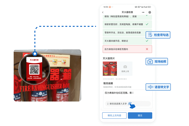 ●工厂/仓库:消防沙箱、电气柜、危险品区域、油料间的日常巡查,以及安全培训签到,动火作业申请等管理。