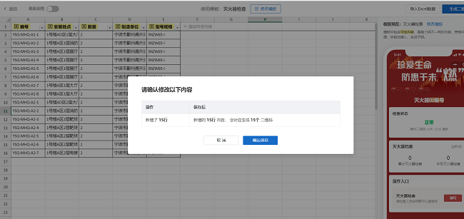 模板修改保存后,可通过“批量生码”功能,导入整理好的设备台账,一次性生成全部二维码。