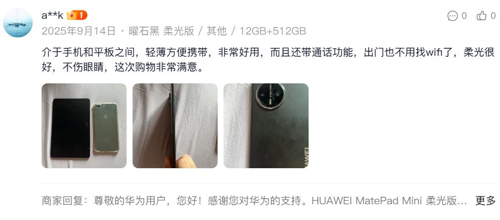 而最让用户惊喜的,莫过于其“平板手机二合一”的通信能力。“门也不用找WiFi了”“关键时刻还能当主力机用。”华为MatePad Mini全系支持插卡通话与蜂窝网络,摆脱了传统小平板对Wi-Fi和手机热点的依赖,使其成为真正独立的“第二屏”,极大拓展了使用边界。