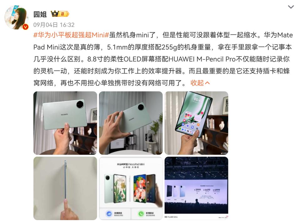 比如,有科技博主认为,“华为MatePad Mini这次是真的薄,5.1mm的厚度搭配255g的机身重量,拿在手里跟拿一个记事本几乎没什么区别。8.8寸的柔性OLED云晰柔光屏搭配HUAWEI M-Pencil Pro手写笔,不仅能随时记录你的灵机一动,还能时刻成为你工作上的效率提升器。而且最重要的是它还支持插卡和蜂窝网络,再也不用担心单独携带时没有网络可用了”。