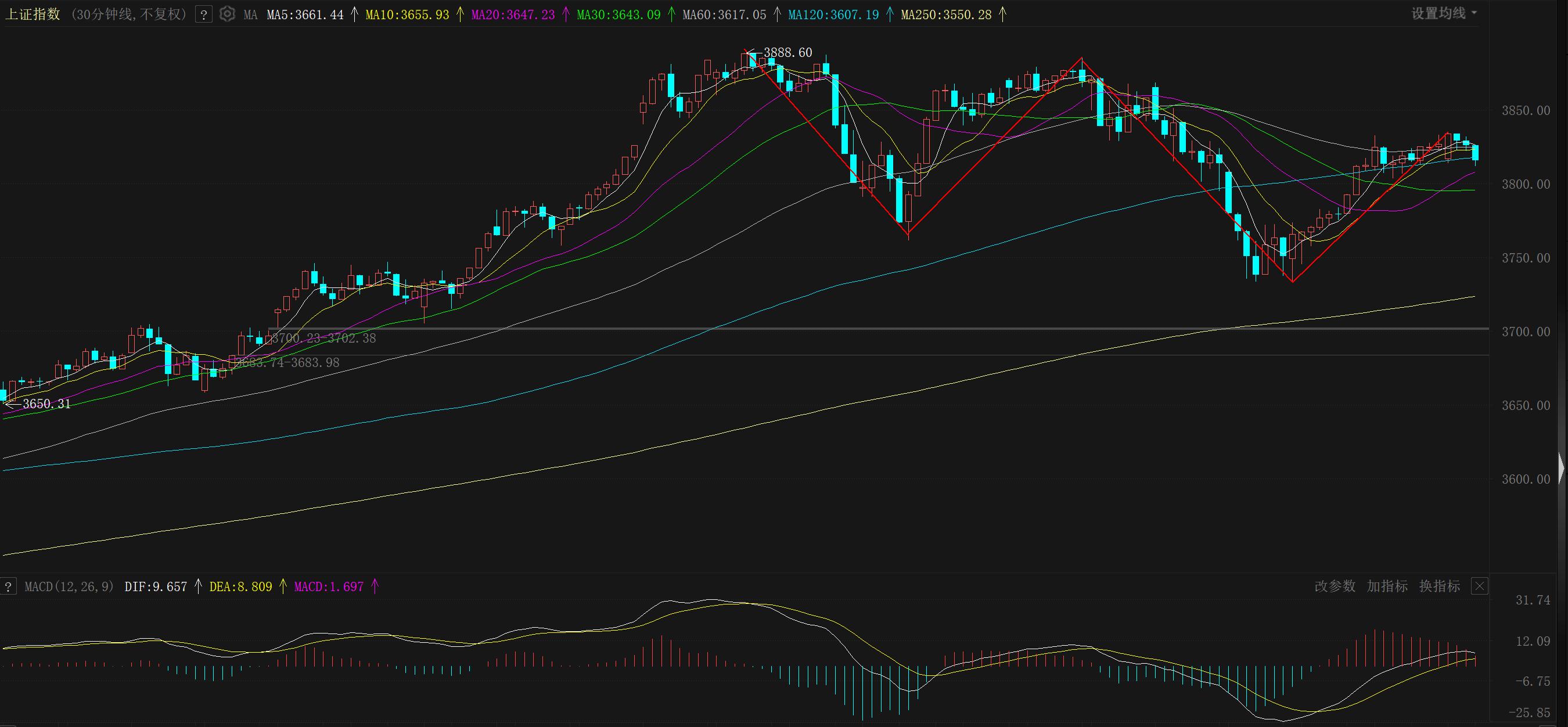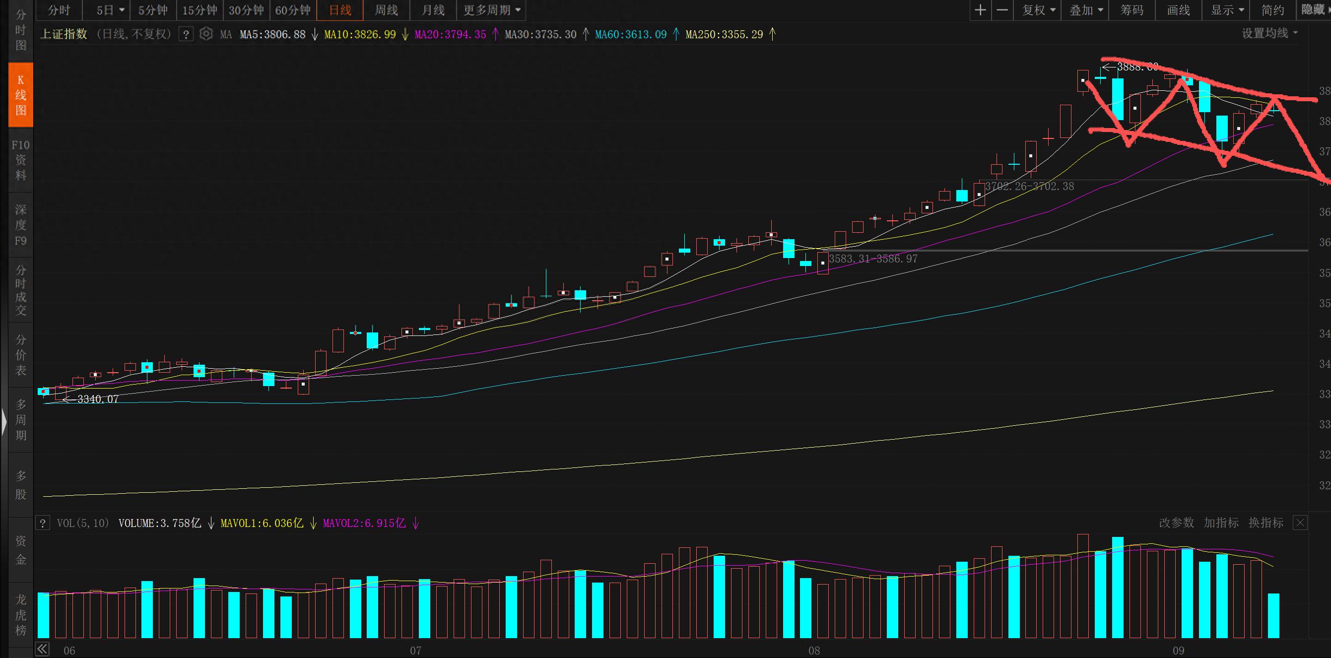 大盘由3888点调整开始,目前已经走了11天,这一波调整的特点就是高点不创新高,低点创新低的标准调整走势,节奏也很相似3-4天下跌接一个3-4天的反弹,目前短期又反弹了4天,那么今天和明天就很重要,能不能打破这个下跌节奏,如果不能那么整体的仓位控制 就要转变为防守策略,目前老三的食品和百货的仓位还有盈利,还可以支持我坚守,其他板块尤其是高位的如果还有获利,尽量即时离场。
