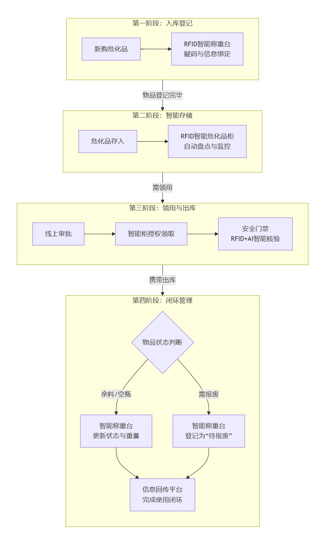 第四阶段:归还与报废(闭环管理)归还/报废操作: 将空瓶或余料带回,在RFID智能称重台上进行操作。称重台读取标签并更新容器状态(如“空瓶”或“余料”重量),数据回传平台,完成本次领用的闭环。报废流程类似,登记后移至废品区。