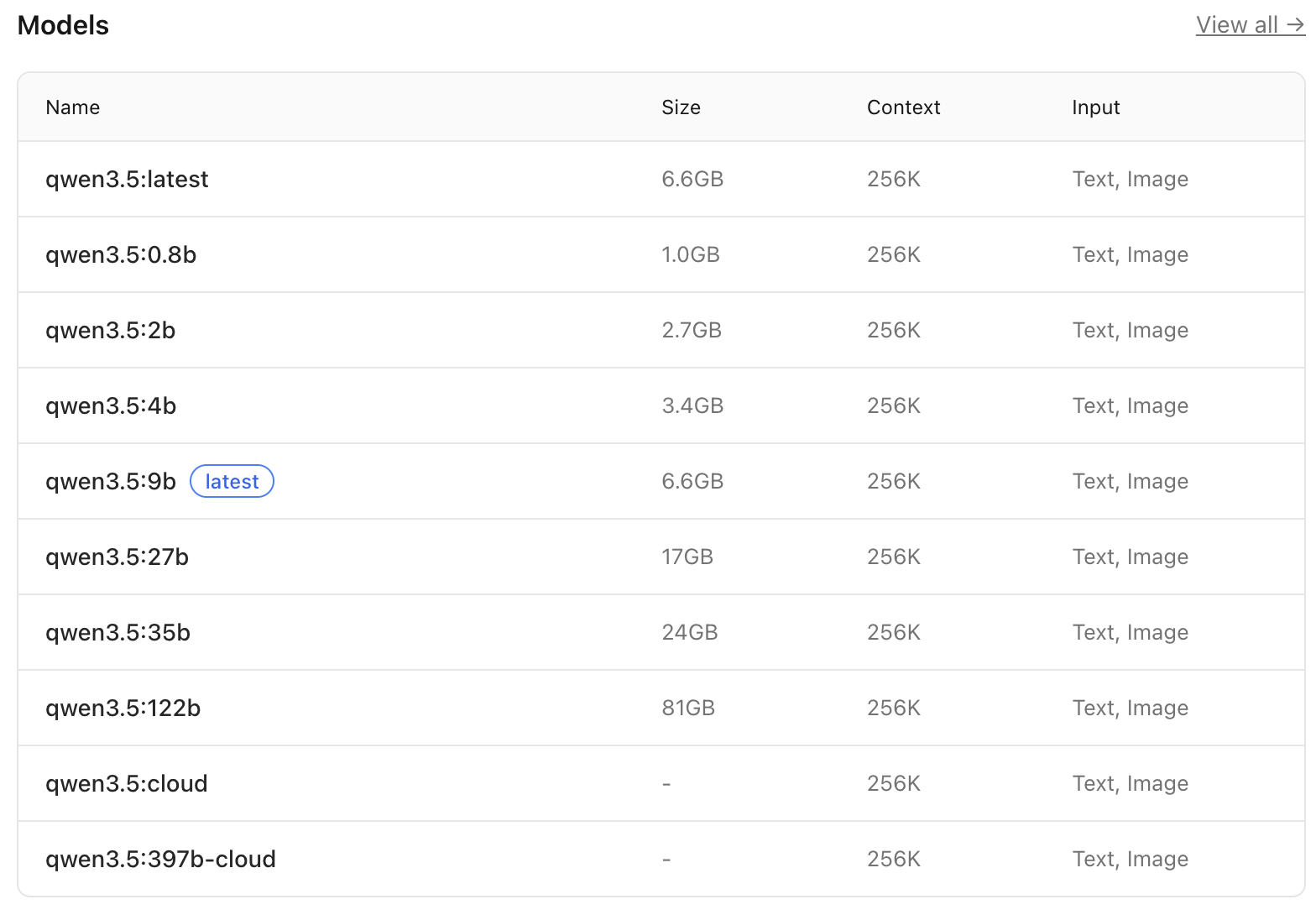 查看本地模型详情模型详情可以在 Ollama Web页面上查看,如 https://ollama.com/library/qwen3.5