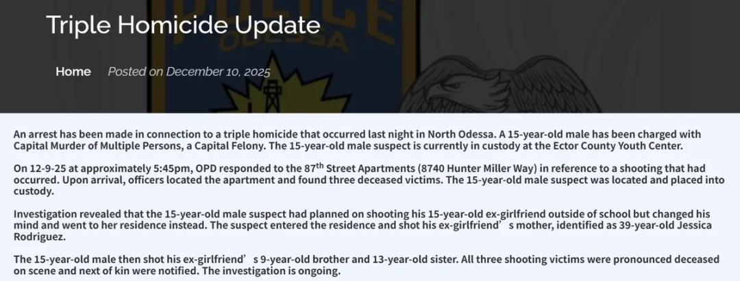 15岁的犯罪嫌疑人被指控犯有重罪多重谋杀罪,并被关押在埃克托县青少年中心。