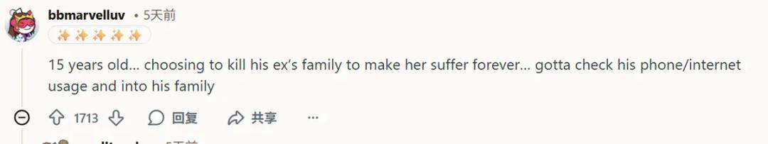 “才 15 岁……为了让前女友一辈子痛苦,居然去杀她的家人……真的该查查他手机、上网记录,还有他家里到底什么情况。”