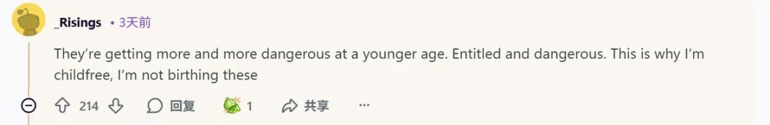 “他们年纪越来越小就变得越来越危险了,又自以为是又危险。所以我才不生孩子——我不要把这种人带到世界上来。”