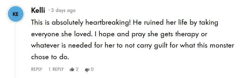 “这真是太令人心碎了!他夺走了她所有爱的人,毁了她的一生。我真心希望她能接受心理治疗或其他必要的帮助,让她不再为这个恶魔的所作所为背负罪恶感。”