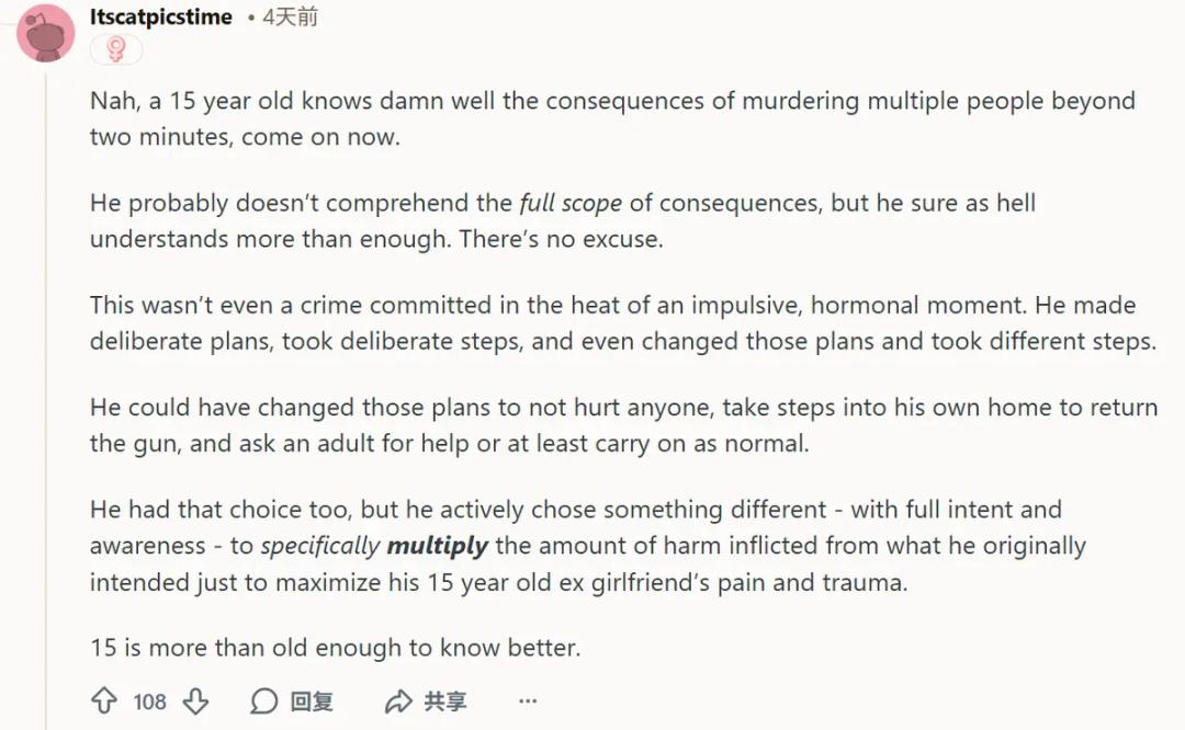 这些选择他都有,但他偏偏主动选了另一条路——在完全清醒、明知故犯的情况下,刻意把伤害扩大,就是为了最大化他 15 岁前女友的痛苦和心理创伤。