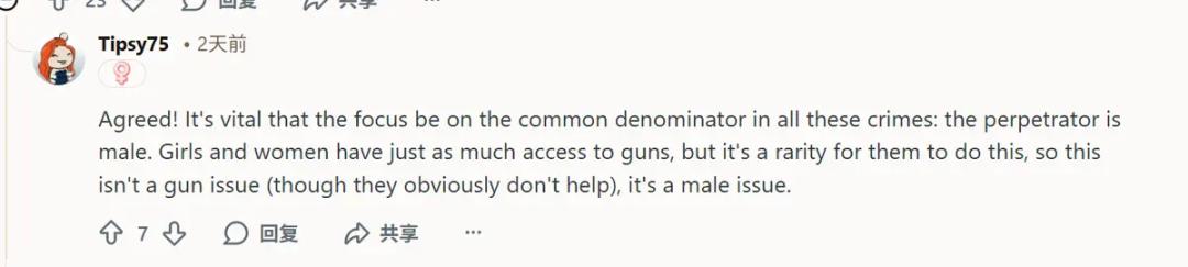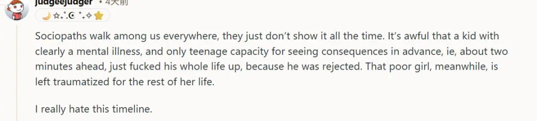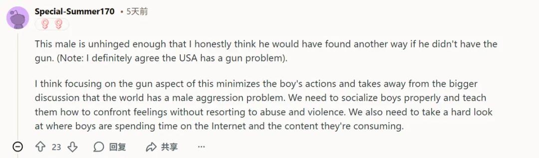 “这个男的已经疯到一个程度了,说实话我觉得就算他没有枪,也会想别的办法下手。(当然,我完全同意美国确实有严重的枪支问题。)