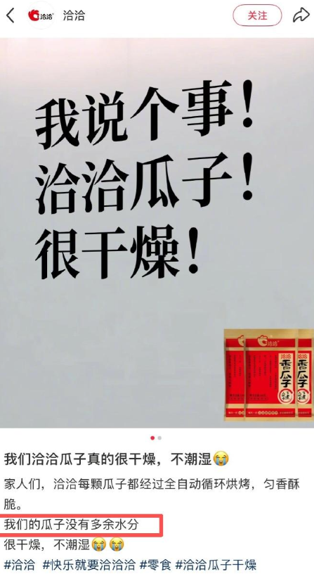 洽洽瓜子官微发布“无多余水分,很干燥”文案,评论区出现“洽洽瓜紫”梗——后者在粉圈语境中常被用于暗指“数据注水”。