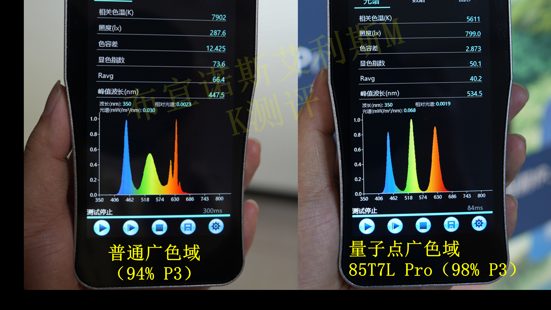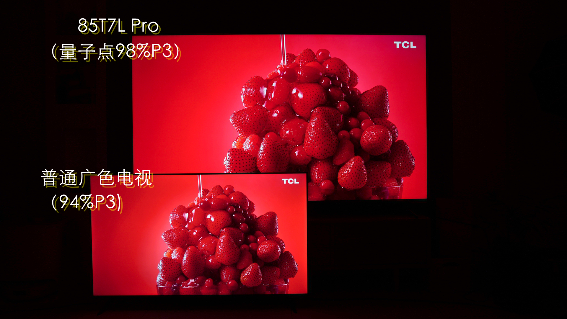 色彩对比:可以看到相比普通广色域电视,量子点广色域的T7LPro红绿黄,颜色更正,尤其是黄绿色一眼可辨。