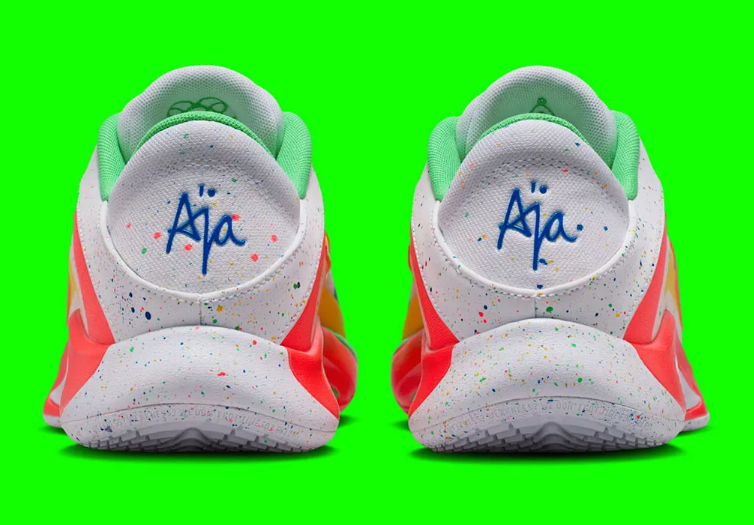而鞋面白色部分并非是单纯的白色,非常有趣的糖霜元素跃然其上,呈现出了较为出色的色彩观感;再加上丰富多彩的其余元素,确实呈现出了较为优秀的色彩体验;A'ja Wilson自身是非常喜欢各种甜品的,在鞋履的设计中也常常加入这些元素,最近放出的几个新配色中糖果元素可谓是非常明显。