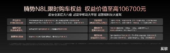 为回馈广大用户的支持与信赖,腾势N8L特别推出限时购车权益,权益价值至高10.67万元!包括价值1.7万元的三年免息,最高1万元的置换补贴。此外,不必担心因为交车晚,享受不到购置税补贴:在2025年11月30日24点前完成合同签署的用户,如果因非用户原因车辆未及时交付,导致开票实际发生在2026年,可享受购置税差额补贴,最高1.5万元!