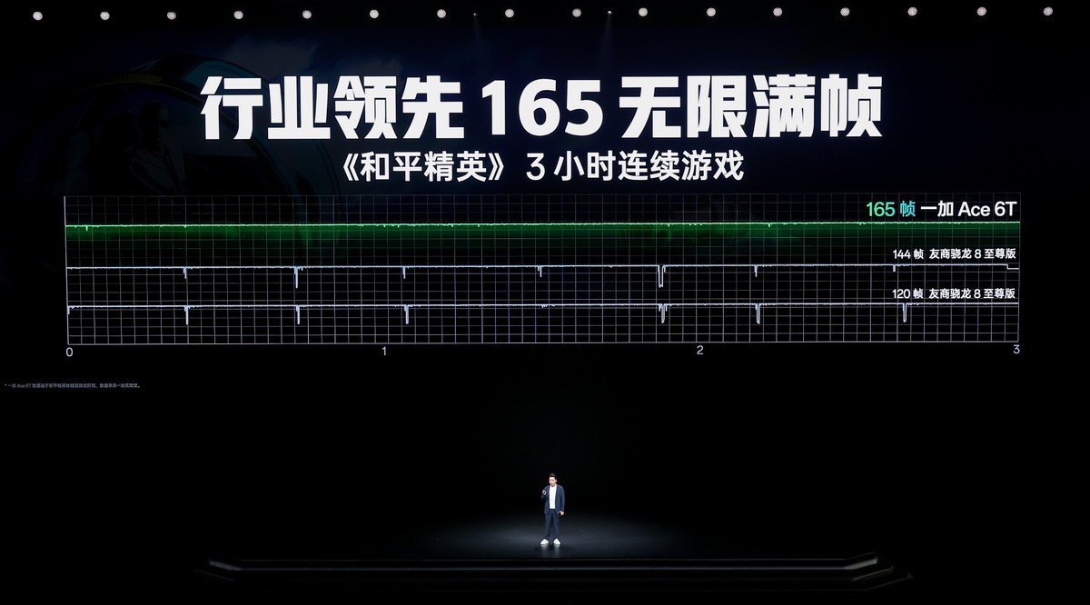 一加Ace 6T将独家自研的全新一代「风驰游戏内核」写入第五代骁龙8芯片底层,充分释放这颗芯片全部性能,大幅提升游戏表现。在风驰游戏内核的加持下,一加 Ace 6T可以轻松驾驭 165 超高帧游戏,实现同档唯一 165 无限满帧游戏体验。相比主流手机的120帧,一加Ace 6T的165 超高帧游戏每秒画面显示数量多45帧,画面显示速度提升27%,全链路操作时延缩短10ms,每秒操控速度提升17%,操作响应快人一步,不仅提高了游戏的流畅性,也提高了游戏的胜率。实测显示,一加 Ace 6T连续运行《和平精英》3小时,帧率持久流畅,帧率稳定性优于同等环境下友商骁龙8至尊版机型的120帧或144帧游戏表现,且在1% Low帧表现上也做到引领。