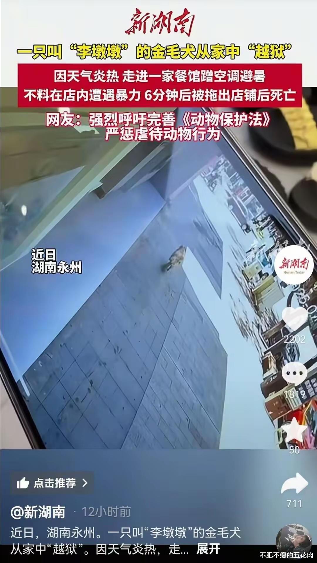 前几天湖南永州发生的事儿,真是让人血压飙升!一只叫“李墩墩”的大金毛,天太热了,从家里“越狱”成功,溜达进一家叫“黔牛味贵州特色铜锅牛肉”的餐馆想蹭会儿空调凉快凉快。结果呢?就短短6分钟!被人用拖把活活打死了!拖出来的时候,狗命都没了!