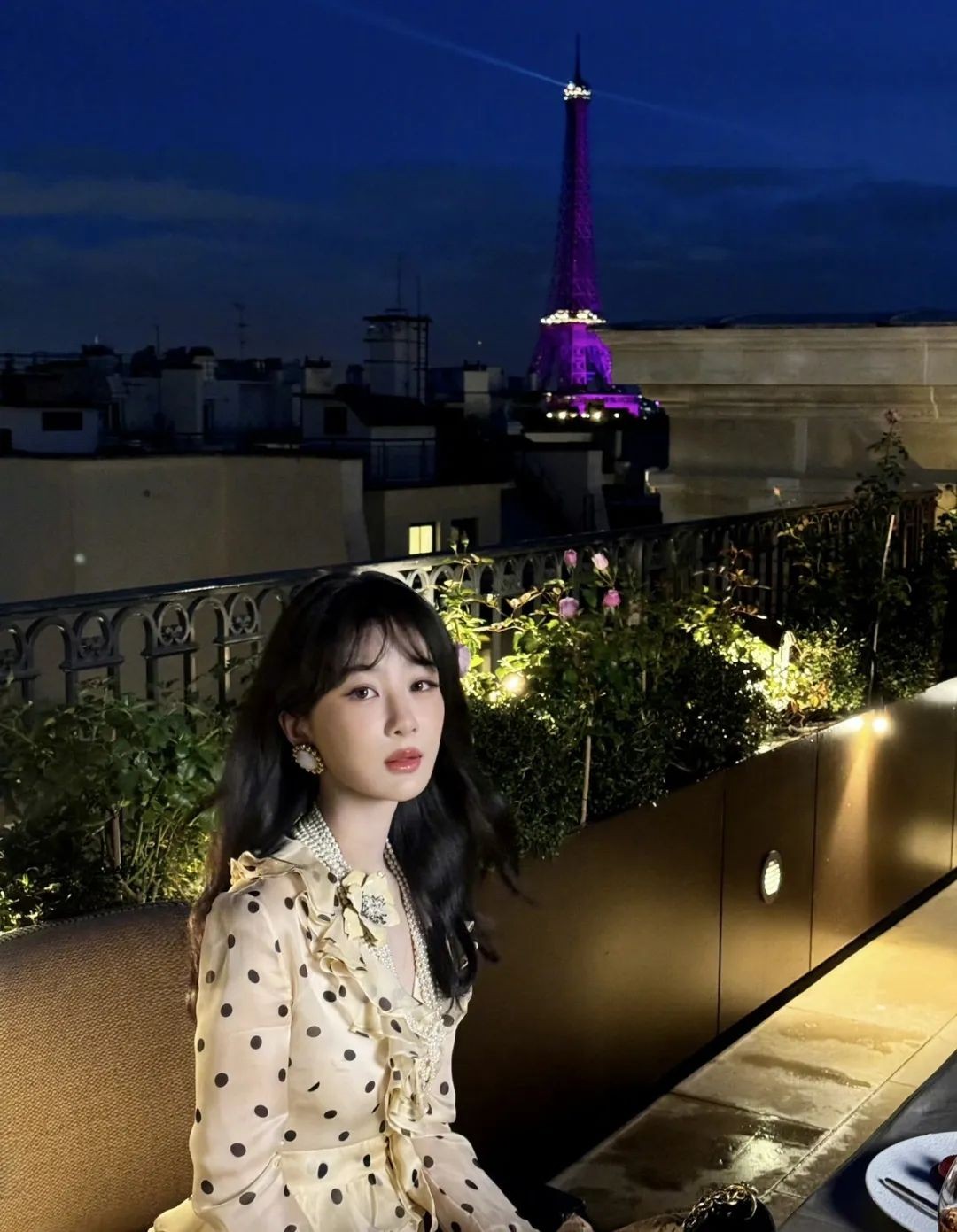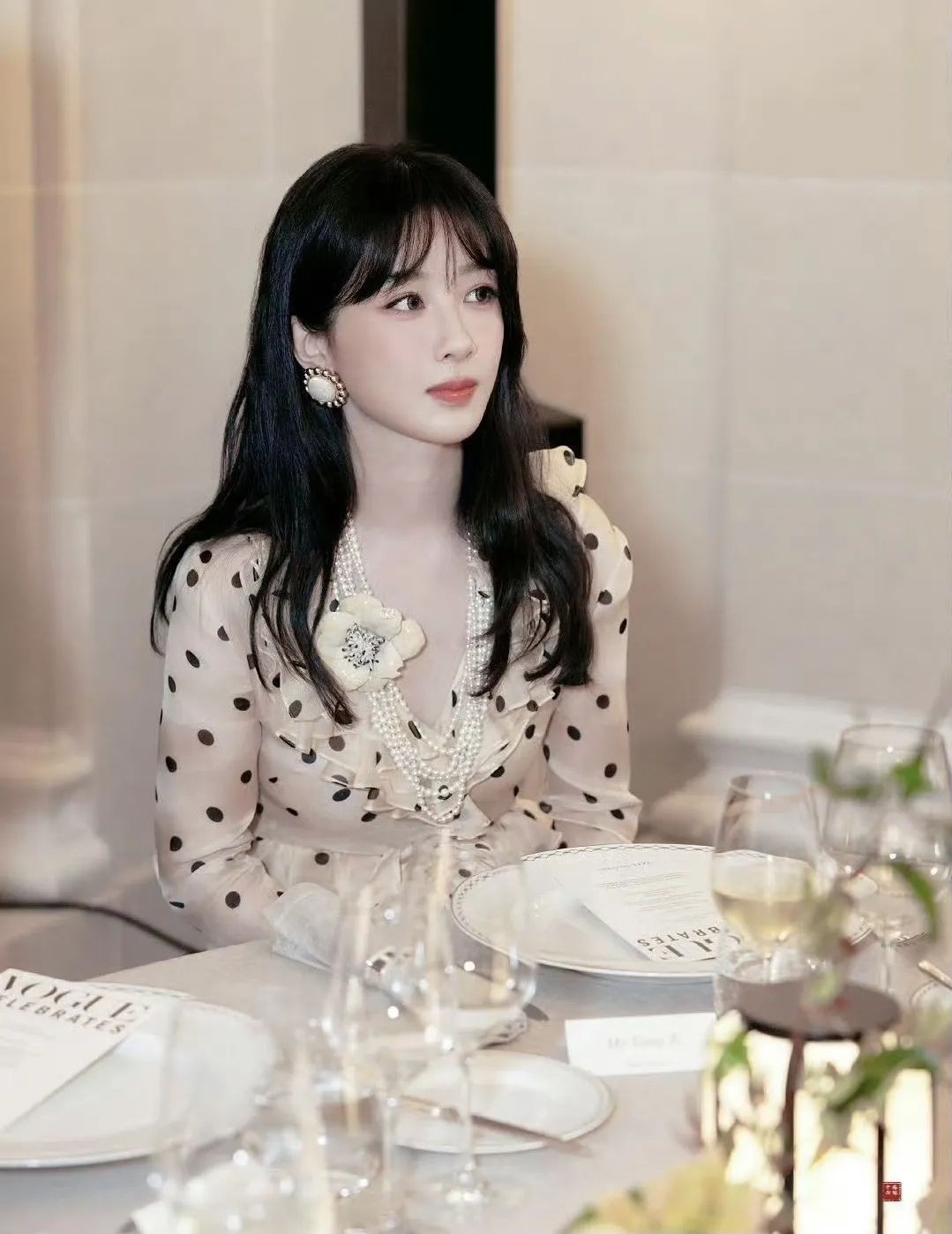 这件裙子的版型就不用说了,虽然有点小职业,但是整体的细节却展现得很俏皮,所以并不会显得过于成熟和老气,反而会有一种恰到好处的端庄感。而杨紫穿上这件裙子也是打定主意要走贵气路线的,所以层层叠叠的珍珠项链非常的华丽,配上领口的花朵,真的是显得整个人娇艳欲滴呀。