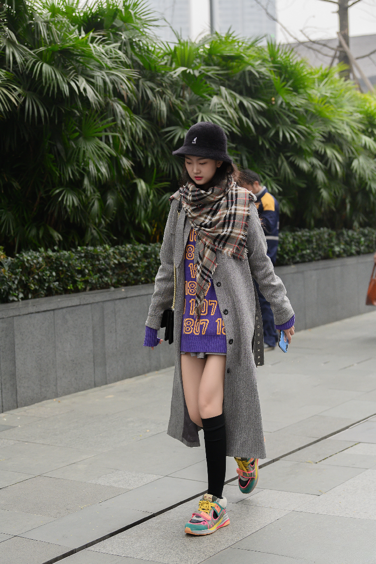 想要在冬日街头展现独特个性?那就试试这套混搭风!长款灰色大衣经典又百搭,内搭紫色印花毛衣,鲜艳的色彩瞬间打破了灰色的沉闷,增添了活泼与俏皮。下身搭配短裤和黑色长袜,玩起“下衣失踪”,露出修长美腿。再蹬上一双色彩斑斓的运动鞋,时尚感拉满。脖子上围的格子围巾更是为整体造型加分不少,复古又时尚,让你在冬日街头成为最耀眼的存在!🧣