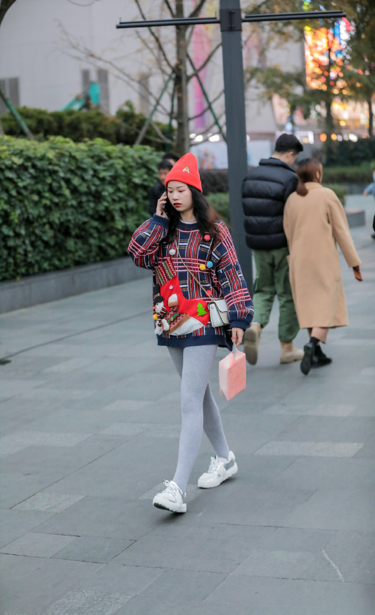 冬日也要活力满满!这位小姐姐的穿搭充满了青春气息。彩色格子毛衣色彩鲜艳,图案活泼,仿佛把彩虹穿在了身上。搭配灰色打底裤和白色运动鞋,简约又舒适。红色的毛线帽为整体造型增添了一抹亮色,与毛衣的颜色相呼应,协调又时尚。手里拿着粉色包包,走在街头,就像一个可爱的精灵,充满了青春活力,让你在冬日也能成为人群中的焦点!🎀