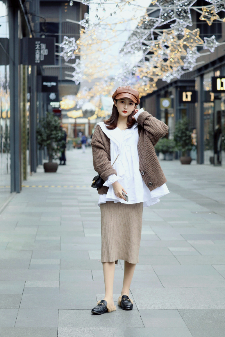想要打造温柔文艺的穿搭风格,这套一定不能错过!白色娃娃衫纯净又可爱,搭配卡其色针织开衫,温暖又柔和。针织开衫的纹理细腻,增添了一份质感。下身搭配同色系的针织半身裙,整体色调统一和谐,尽显温柔气质。头上的棕色贝雷帽为造型增添了一份文艺气息,脚上的黑色乐福鞋则让整体穿搭多了一份精致感。手里拿着手机,站在街头,仿佛是从画中走出来的文艺少女,清新又迷人!🎨