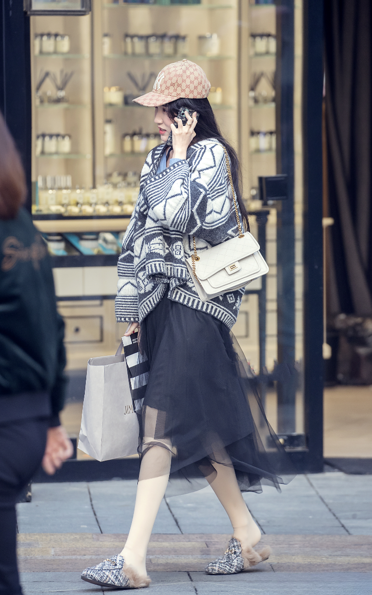 甜妹们看过来!这件花纹毛衣也太好看了吧!黑白相间的图案时尚又经典,宽松的版型舒适又自在。搭配黑色纱裙,轻盈飘逸,仿佛是从童话中走出来的公主。头上的粉色棒球帽增添了一份甜美与可爱,手里的白色链条包则为整体造型增添了一份精致感。脚上的毛绒拖鞋更是可爱到爆,让你在冬日也能感受到满满的温柔与甜美,轻松打造甜美系穿搭!👗