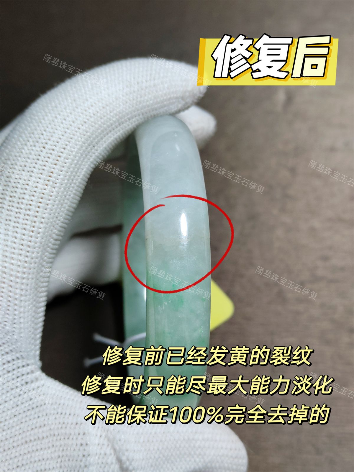 2、如果您的玉镯裂纹是内裂,石纹,这些购买时就自带的裂纹,触摸感觉不出来的,就不是很建议修复,因为玉石粉修复也渗透不进去,修复效果不会怎么乐观。