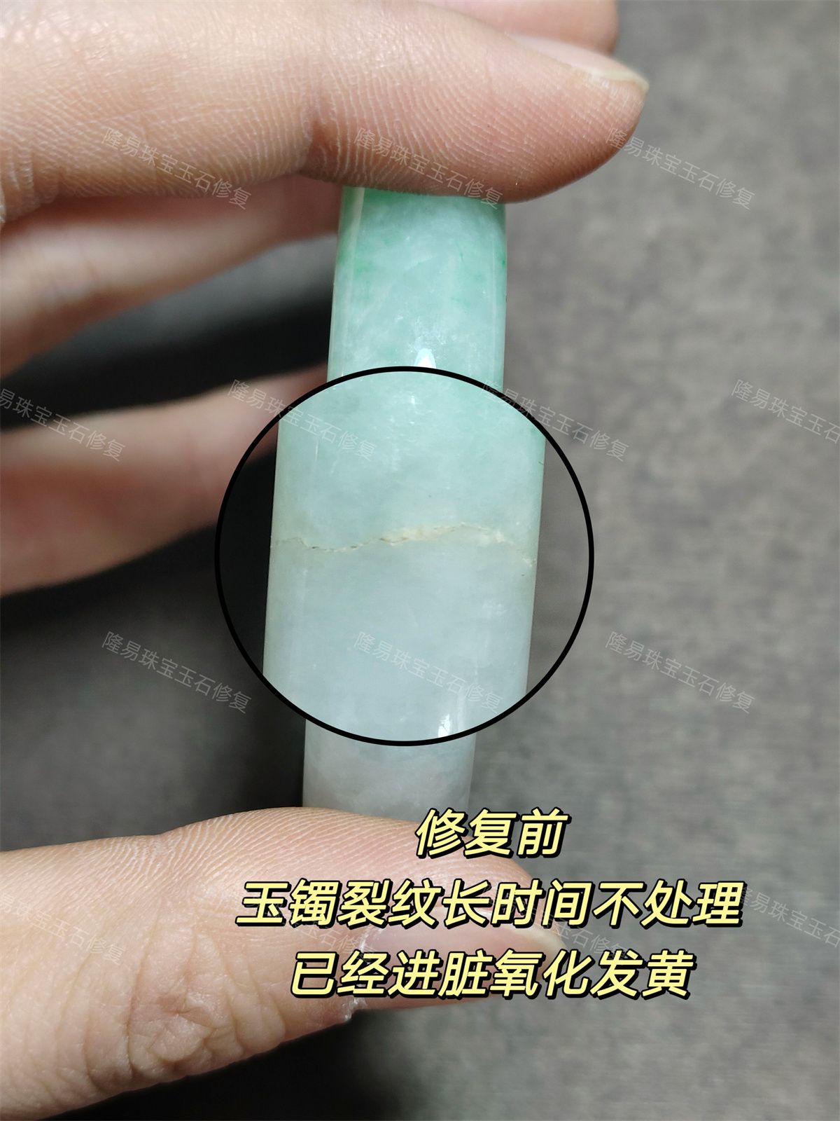 否则时间长,裂纹处进脏了,就像图上这个镯子不及时修,进脏部位发生氧化发黄,就不太好恢复干净了!