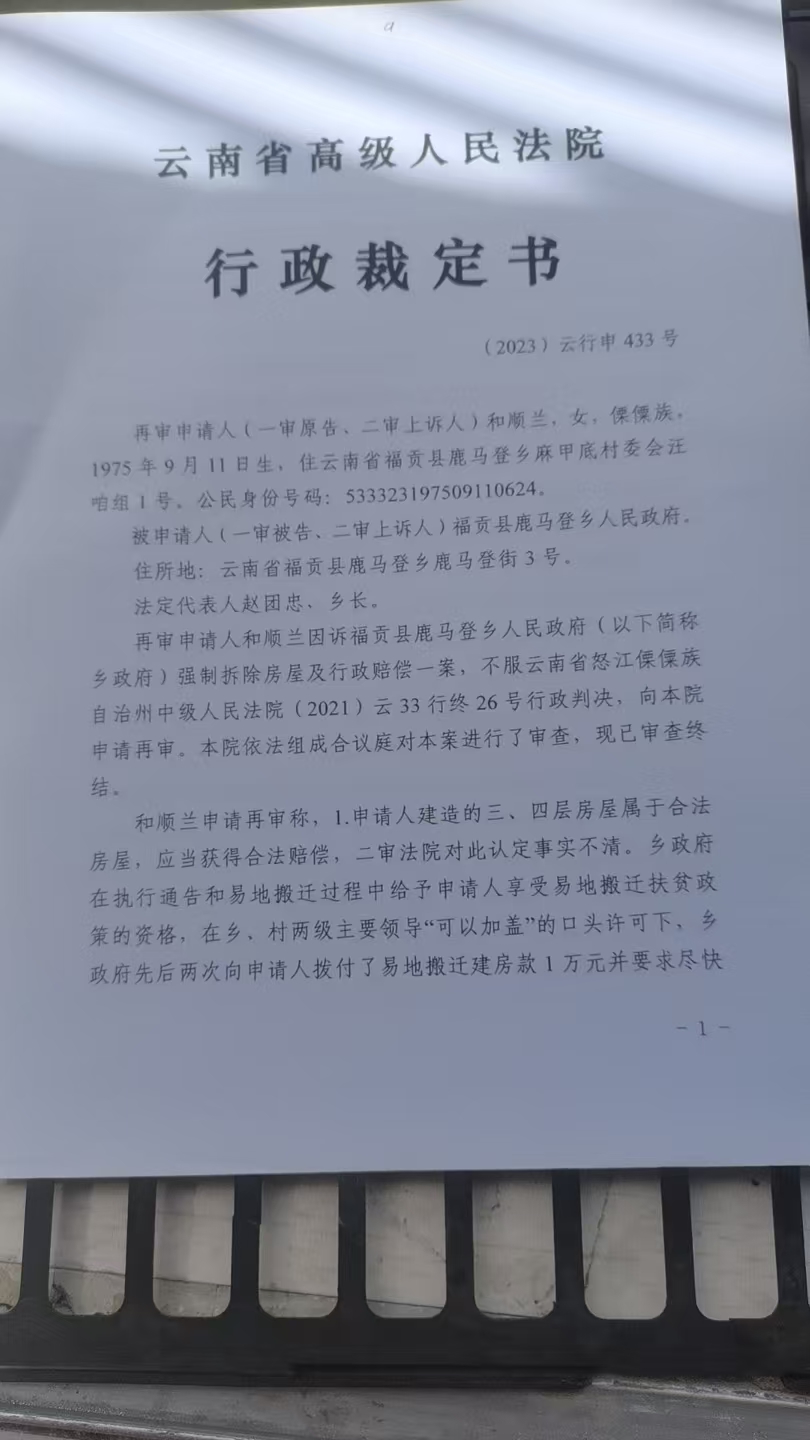 为维护自身权益,和顺兰多次通过法律途径维权。2018年6月,她向福贡县人民法院提起行政诉讼,请求确认强拆行为违法并赔偿损失。法院于2021年6月作出判决,认定当地在拆除过程中存在“程序瑕疵”,但未支持其对三、四层房屋的赔偿请求。她随后上诉至云南省高级人民法院,但再审申请被驳回。和顺兰反映,其提交的部分证据未被充分采信,且案件审理过程中曾出现材料流转延迟等情况。