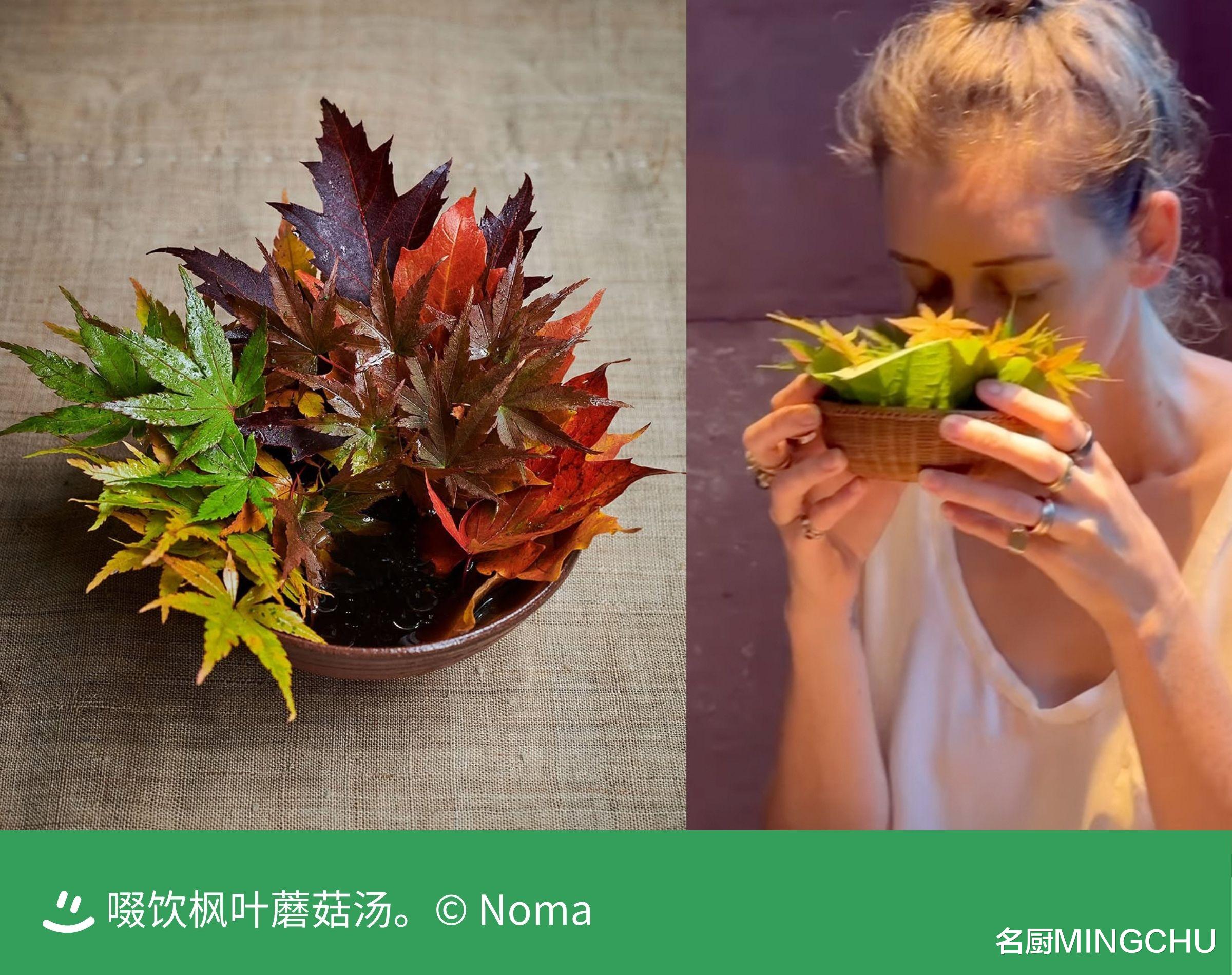 Noma 在京都快闪时,有一道枫叶蘑菇汤,如果仔细观察,浸入汤中的枫叶上撒有小料。食客将鼻子埋在叶片中啜饮汤汁,加深嗅觉体验。