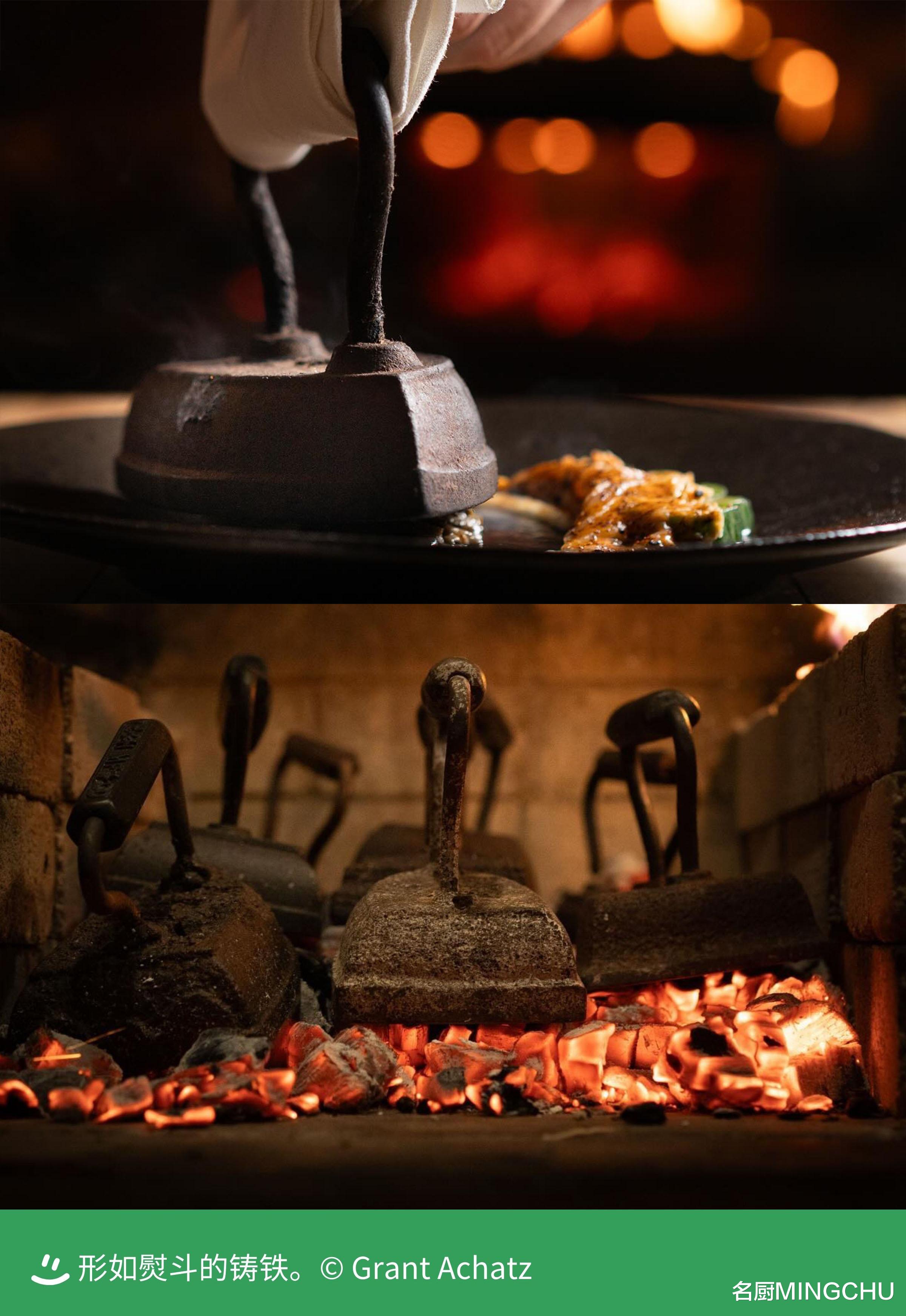 主厨介绍道,“我们用一种古老的铸铁烙舞茸,也被称为‘Sad Iron’,源于古英语,意为‘坚固的’或‘沉重的’,我们在古董店寻找餐具时偶然发现了这些烙铁,它们很重、很密,可以吸收炉煤产生的大量极高热量。重量和热量使其成为压平及烙蘑菇的完美工具,创造出酥脆的焦化表面,同时散发出烟熏味,滋滋作响的橄榄油和蘑菇的复合香味。”