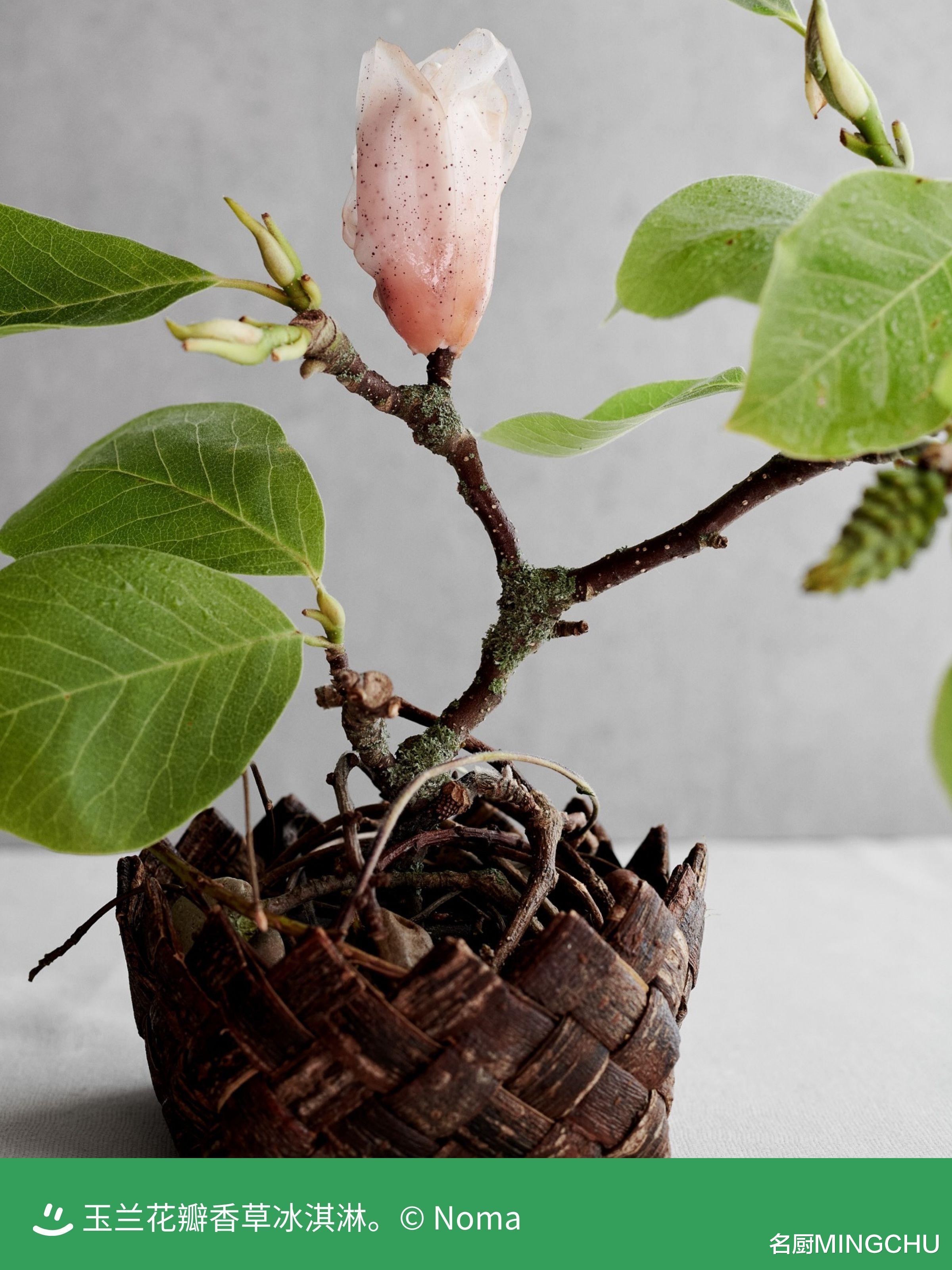 Noma 有一款用玉兰花瓣包裹的香草冰淇淋,就像一朵娇嫩的鲜花在树枝上含苞待放,香草风味的冰淇淋弥补了玉兰花的甜味和姜味,更添细腻层次感。