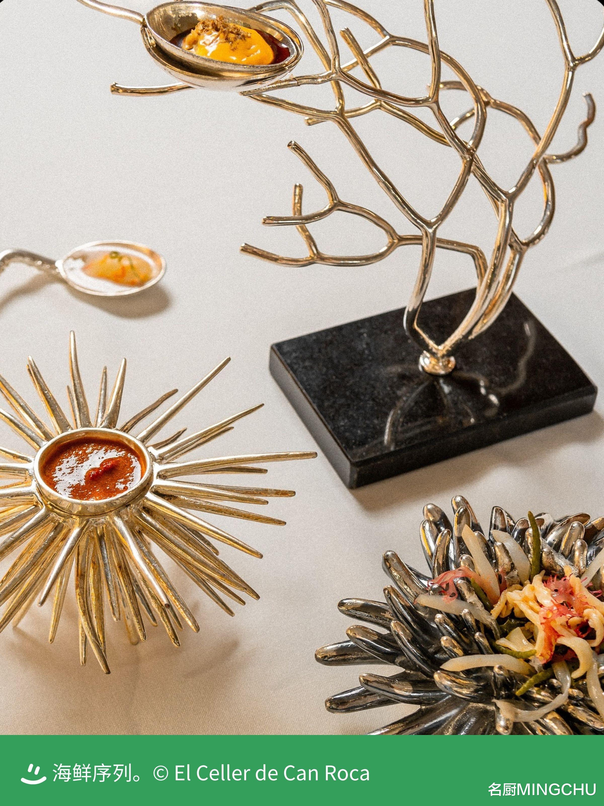 El Celler de Can Roca 在餐桌上呈现了一组“海鲜序列”料理,红椒帕门蒂尔墨鱼、帕洛科塔多牡蛎、野味和松露酱、海参配海葵、烤海胆,盛放在多个以海洋为灵感的金色器皿和支架中,形如海藻、海葵、海胆,高低错落有致,生动有趣。