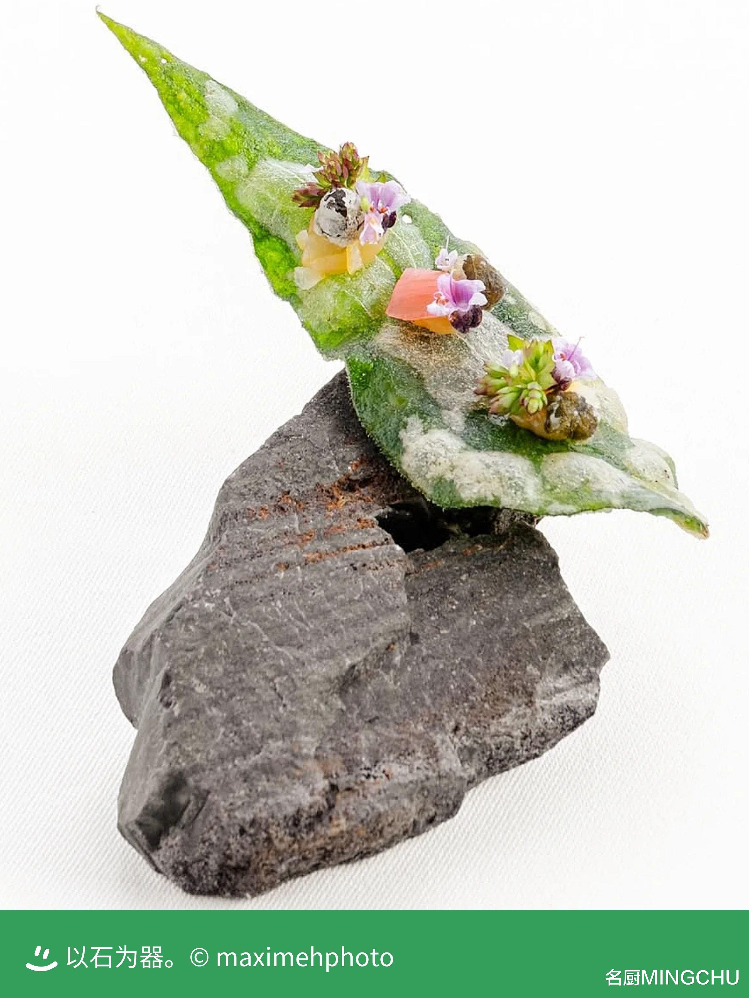 日本京都米其林一星 MUNI Alain Ducasse 主厨 Alessandro Guardiani,常把海螺壳作为酱汁的盛器,比如这款腌制贝类,柑橘类水果,鱼子酱和烟熏辣椒,酱汁从螺口倾泻而下,使用非常便捷。