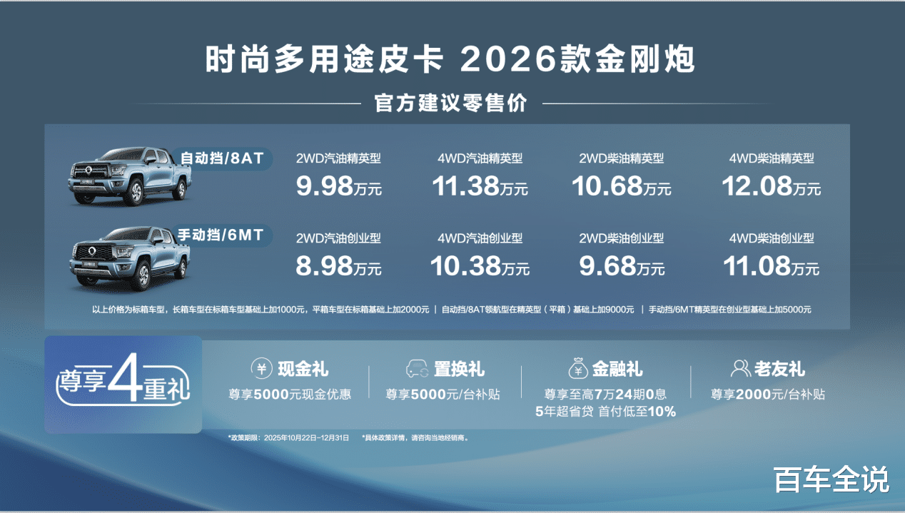 10月22日,时尚多用途皮卡——2026款金刚炮在荆门智慧工厂焕新上市。金刚炮8AT车型,官方建议零售价9.98万元起;金刚炮6MT车型,官方建议零售价8.98万元起。并同步推出5000元现金礼、5000元置换礼、2000元老友礼以及7万24期0息金融补贴四重豪礼。