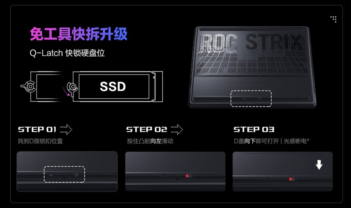 值得一提的是,笔记本 D 面支持 免工具快拆和Q-Latch 快速拆卸硬盘设计,内置光线传感器开后盖自动断电,后期玩家可以根据自己需求升级 PCIe 5.0 SSD,而且双 M.2 均支持PCIe 5.0,为后续升级留有冗余,这点好评。