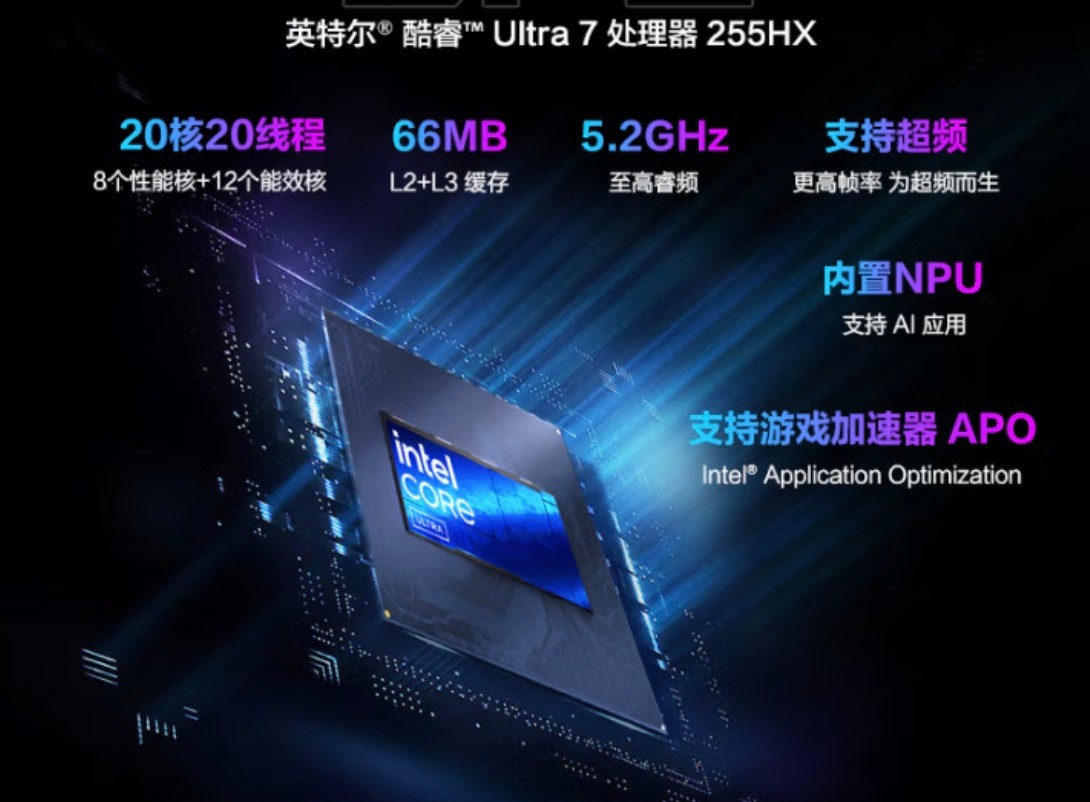 Ultra 7 255HX 处理器基于全新的 Arrow Lake 架构,拥有 8 个性能核(P 核心)与 12 个能效核(E 核心),总共 20 个核心与 20 个线程。性能核最大睿频频率高达 5.2GHz,能效核最大睿频频率也能达到 4.5GHz,总缓存更是高达 66MB,其中 L2 缓存就占了 36MB。如此强大的规格,相比i7-13650HX,在 Cinebench R23 多核分数测试中提升了约 30% 。无论是日常办公中的多任务处理,同时打开多个大型软件,还是运行对 CPU 性能要求极高的游戏,它都能轻松应对,毫无压力,确保系统流畅运行,不会出现丝毫卡顿。