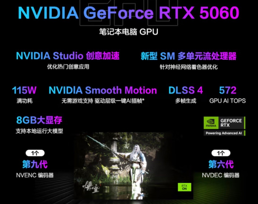 显卡方面,无疑是这次升级的重点。ROG 魔霸新锐2025版采用的 RTX 5060。这款显卡基于最新的Blackwell架构,拥有8GB GDDR7显存,并且支持DLSS4技术,在 115W 满功耗的全力支持下,显卡性能得以充分释放。