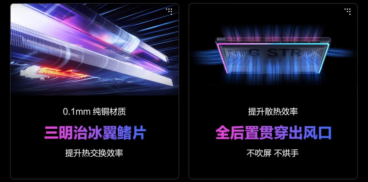 ROG魔霸新锐2025采用的冰川散热架构3.0增强版,由3风扇与大面积均温板组合而成,上下两组冰翼鳍片构成独特的三明治结构,配合Arc Flow绝尘风扇、2代暴力熊液金、内吹设计,实现全后侧贯穿式出风,大大加速了降温效率。