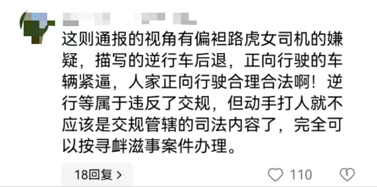 有网友认为,既然打人女子已经后退了,那小伙何必又要顶着她开呢,总感觉这有一种得理不让人的感觉!