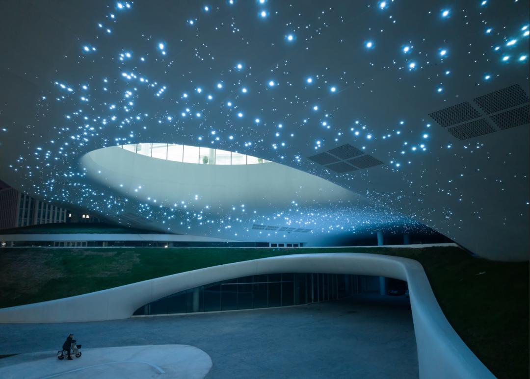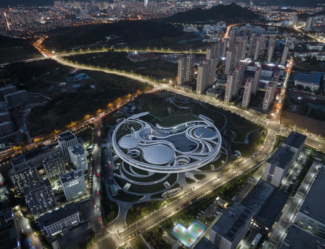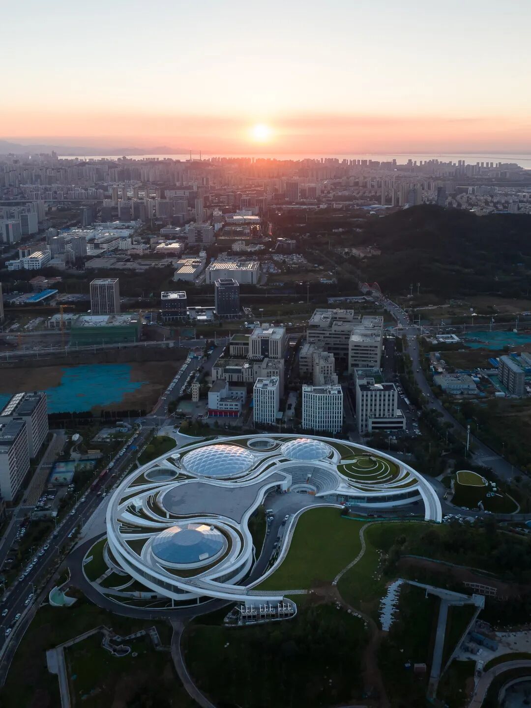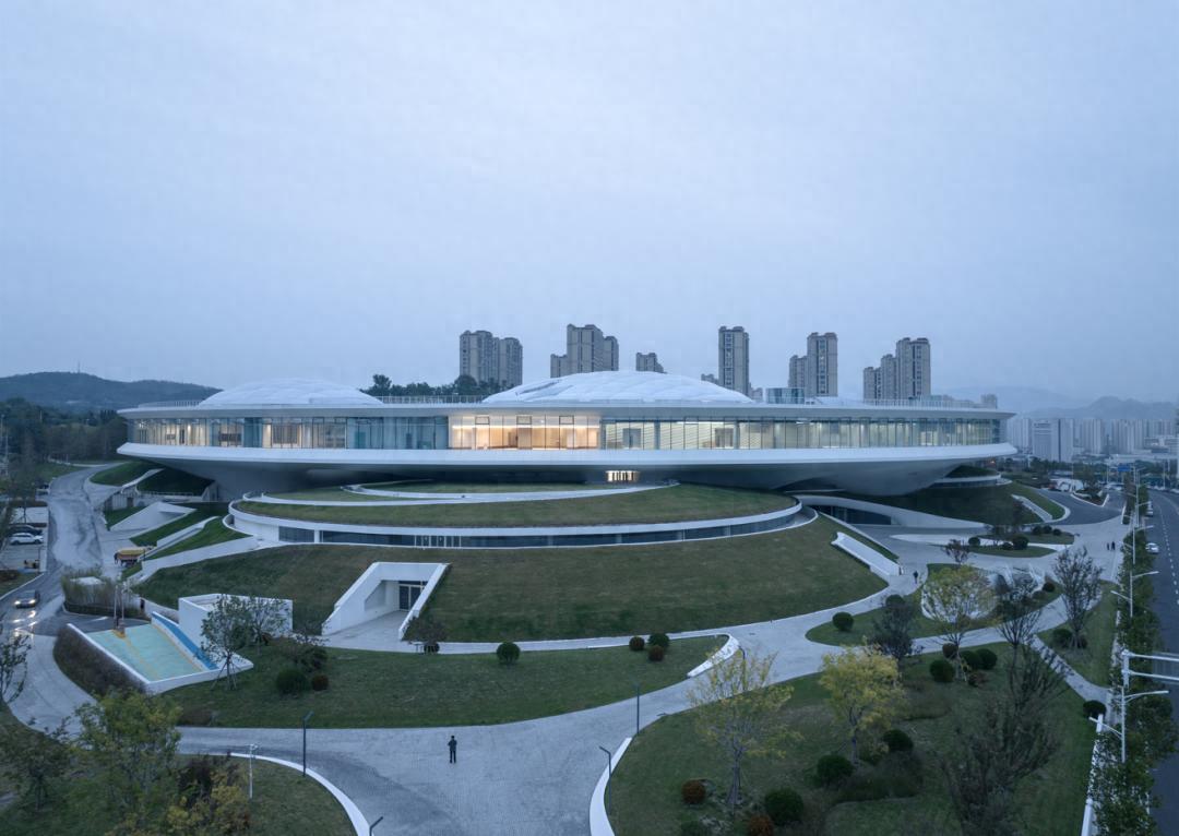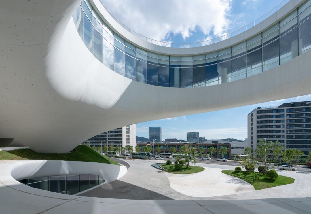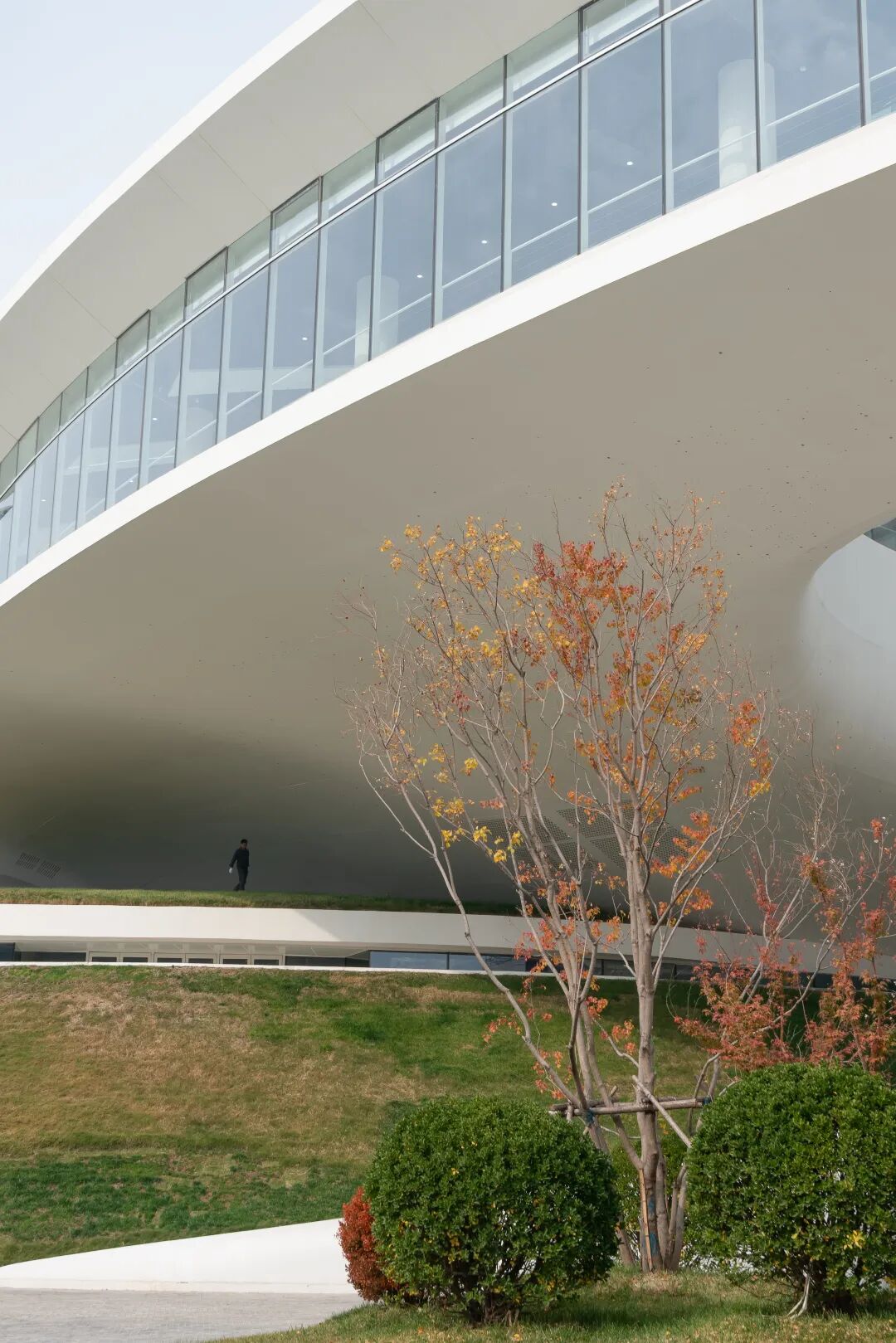 圆,是这座建筑嵌入自然与城市的基本语言。没有明确的朝向,它只是静静地卧在绿地之间,成为一道独特的大地景观,同时也化作俯瞰城市的观景台。