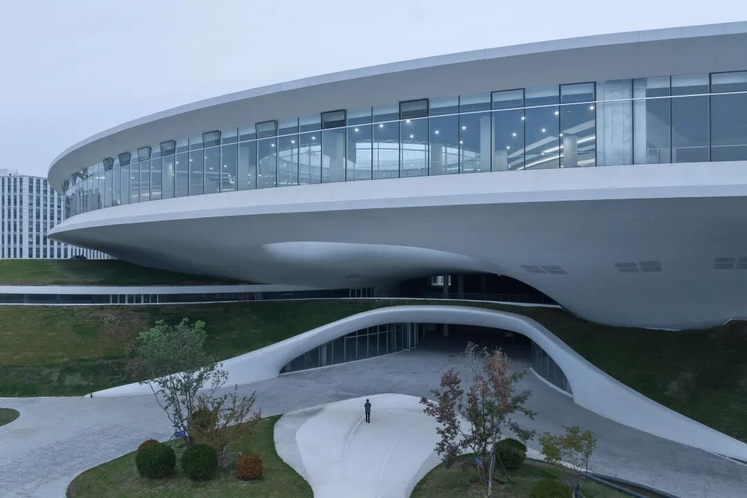 这座仿佛挣脱重力的创享中心被抬升至半空,如同悬浮在地表之上。而其下方,起伏的绿色丘陵温柔覆盖着体验区与餐饮空间,构成一组虚实对照的“平行世界”。