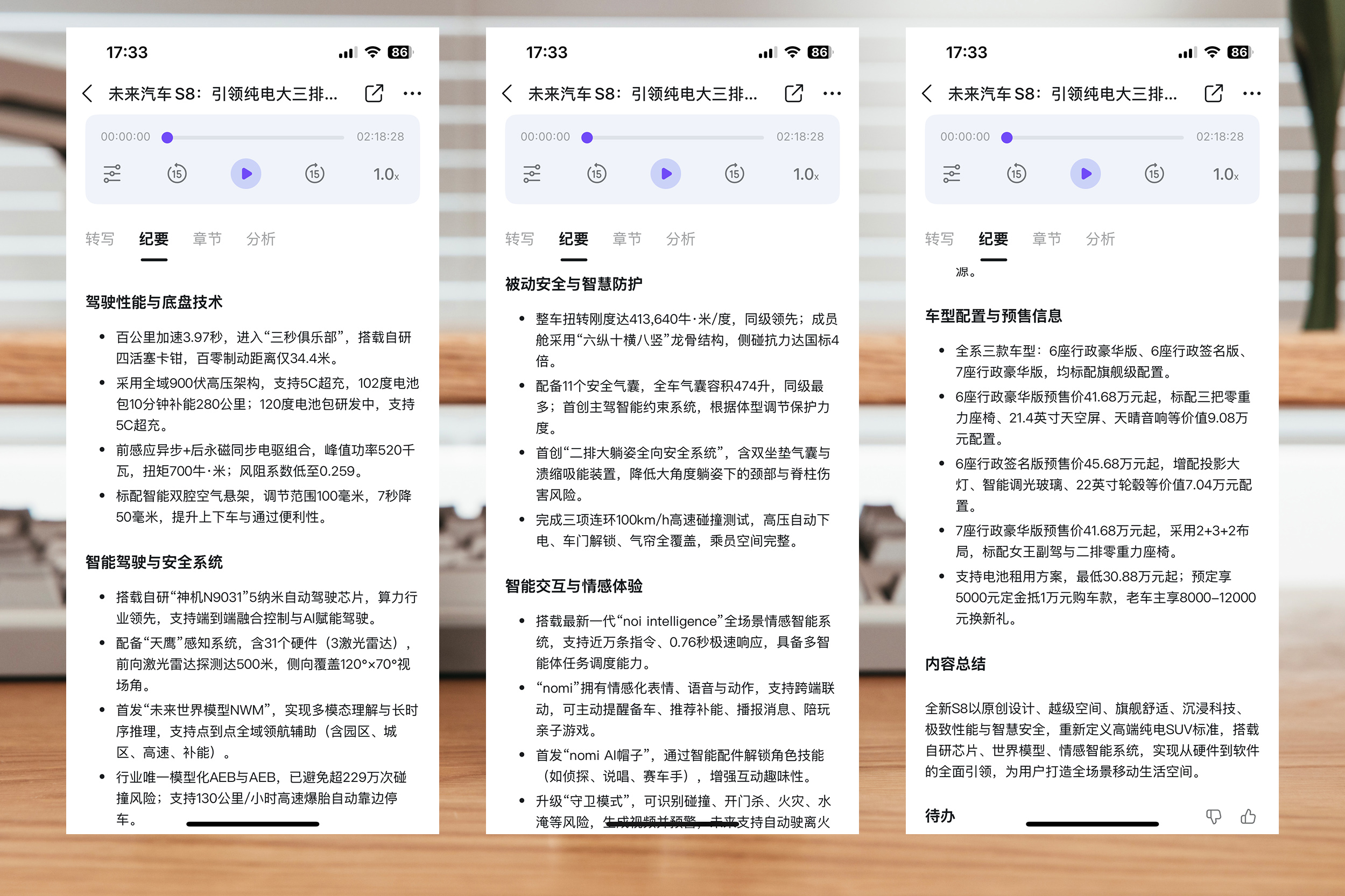 在其生成的纪要中,讲述川藏线上换电站的艰辛和技术发展回望并没有被归纳到其中,毕竟正常发布会的主角是ES8,这点我表现还是很满意的。