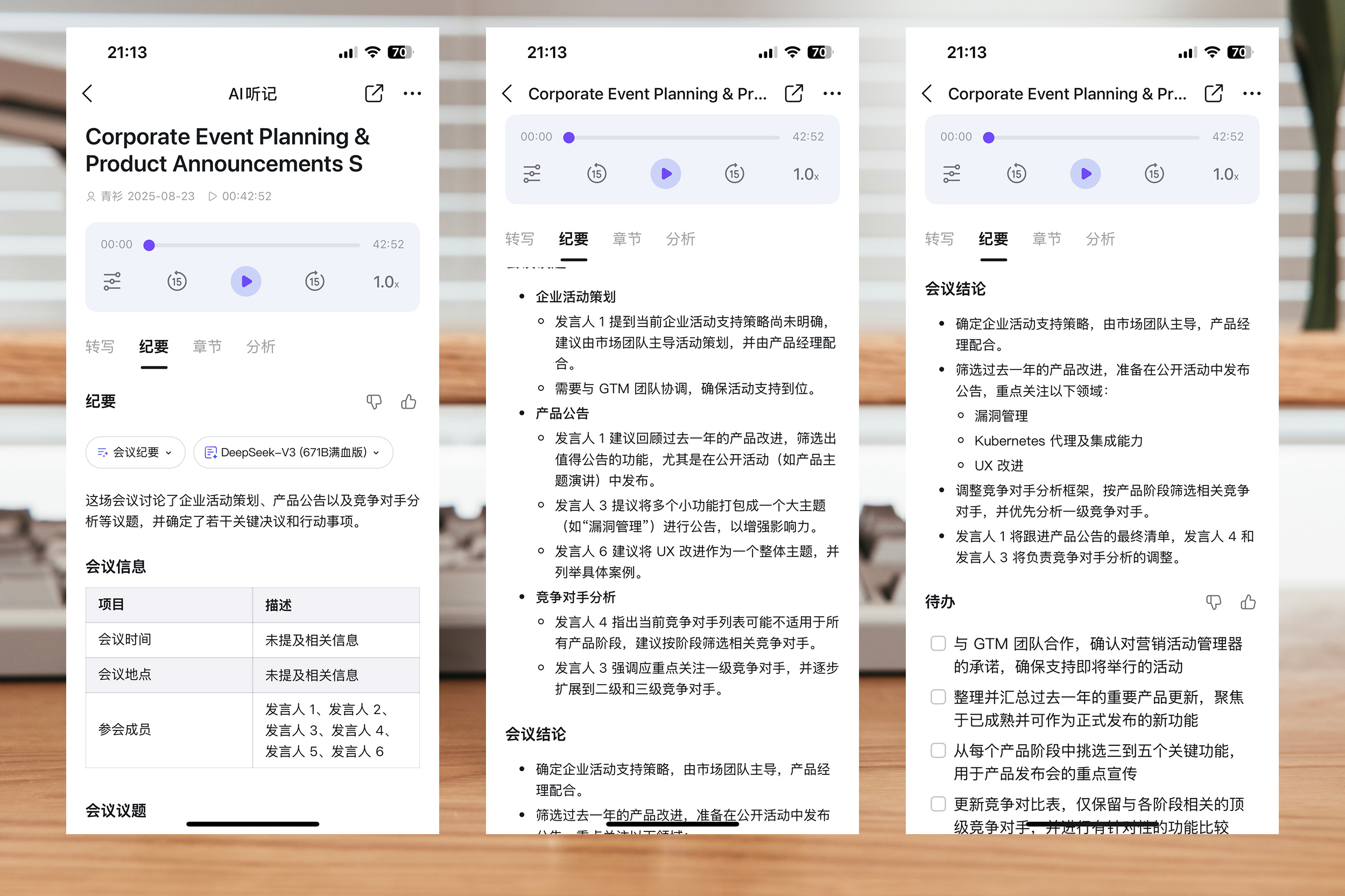 对于会议录音转译加整合分析为纪要,AI确实很高效,这点上来看,生产力是妥妥的。