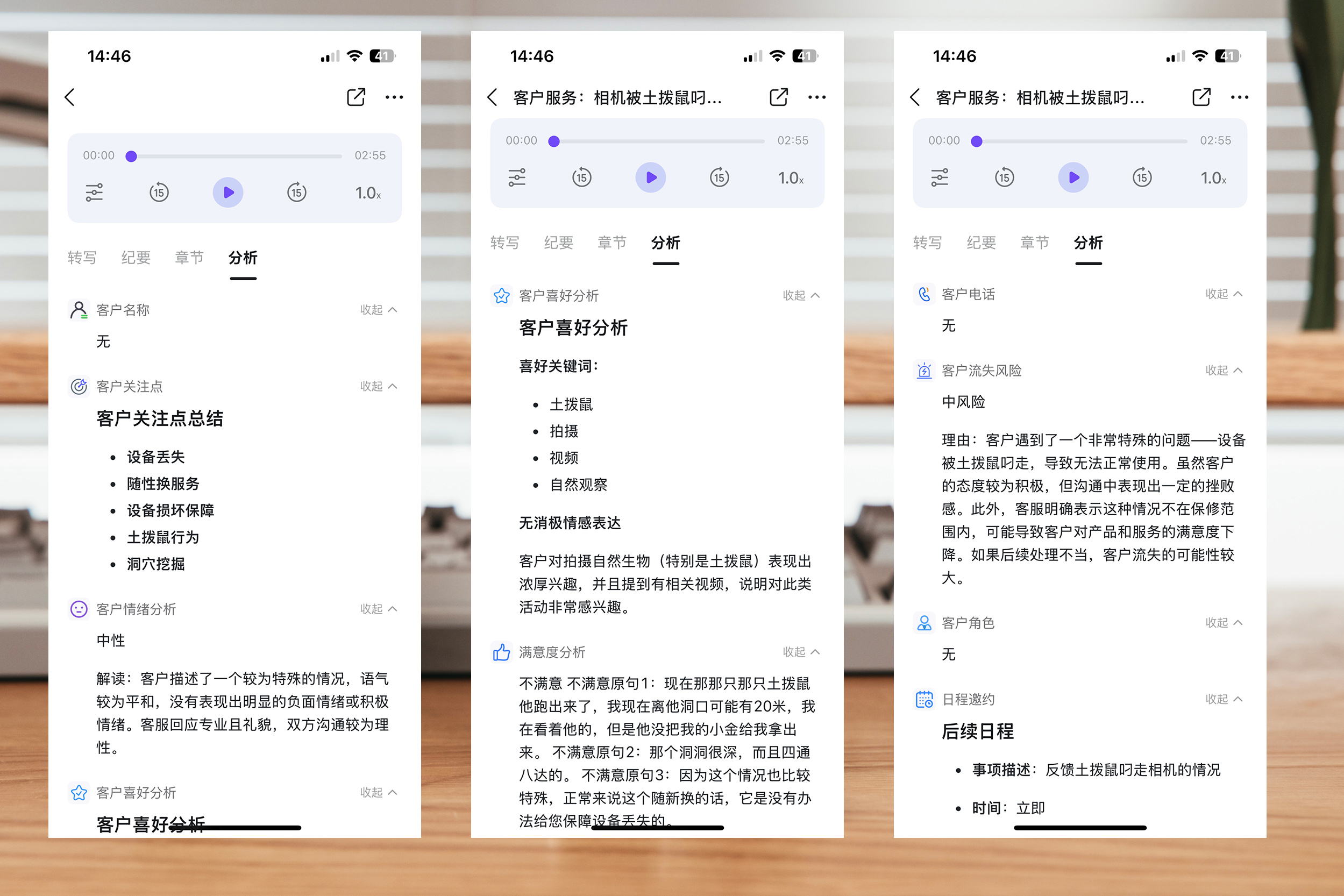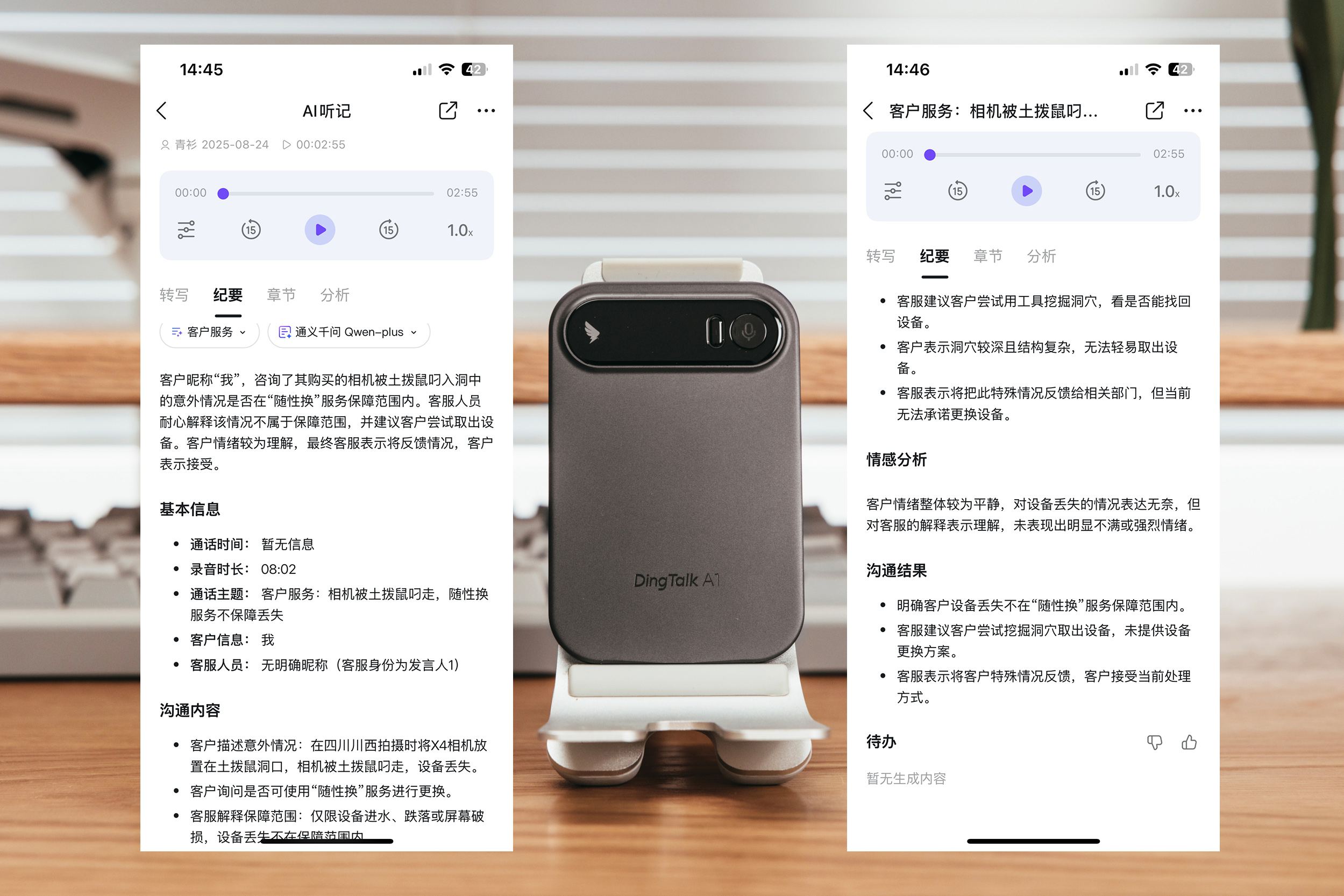 我找了另一个前段时间非常有意思的客服通话记录,是大疆运动相机被土拨鼠抢走的语音通话记录,看看 DingTalk A1的分析。