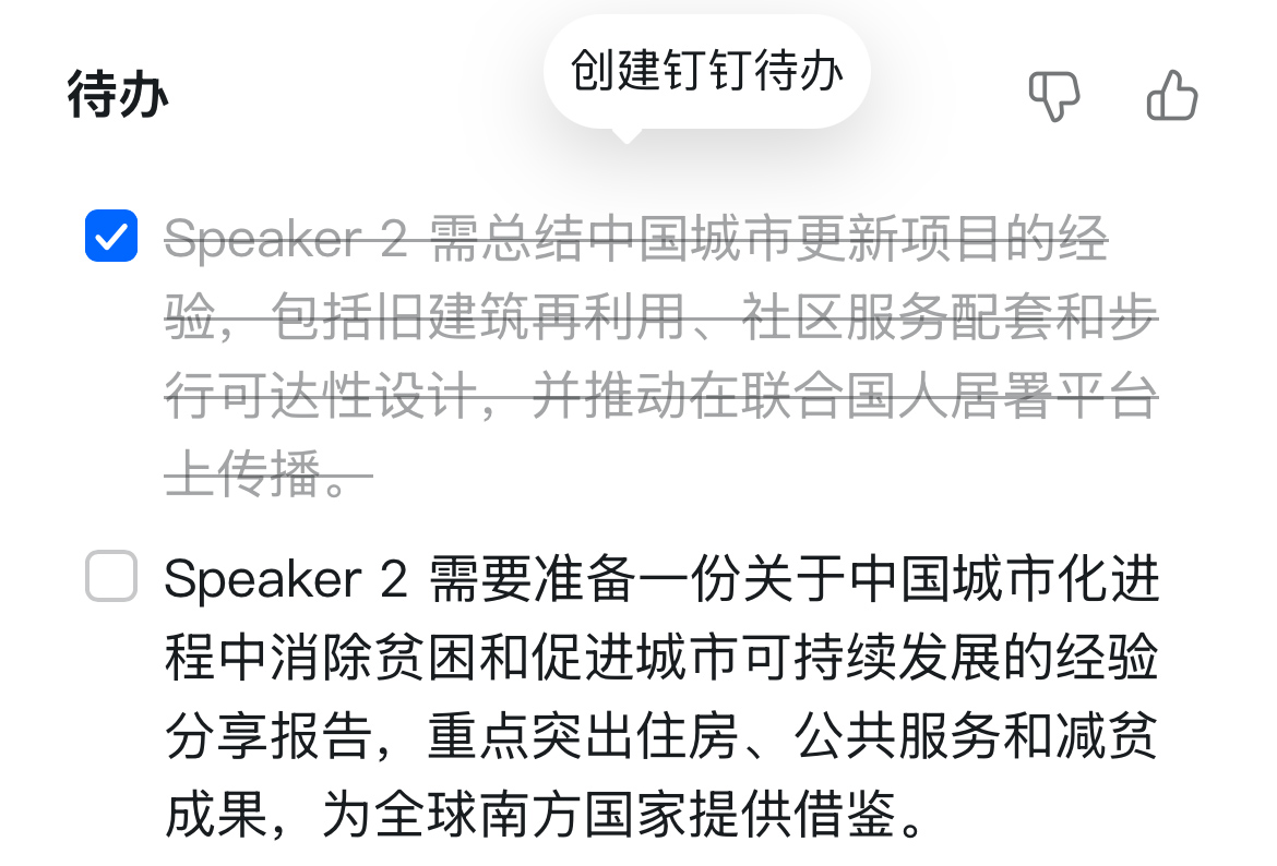 纪要还提供了后续采访建议方向,生成了代办事项,选择对应的代办事项就可以创建钉钉待办,这个主要针对于发言者2,也就是记者。