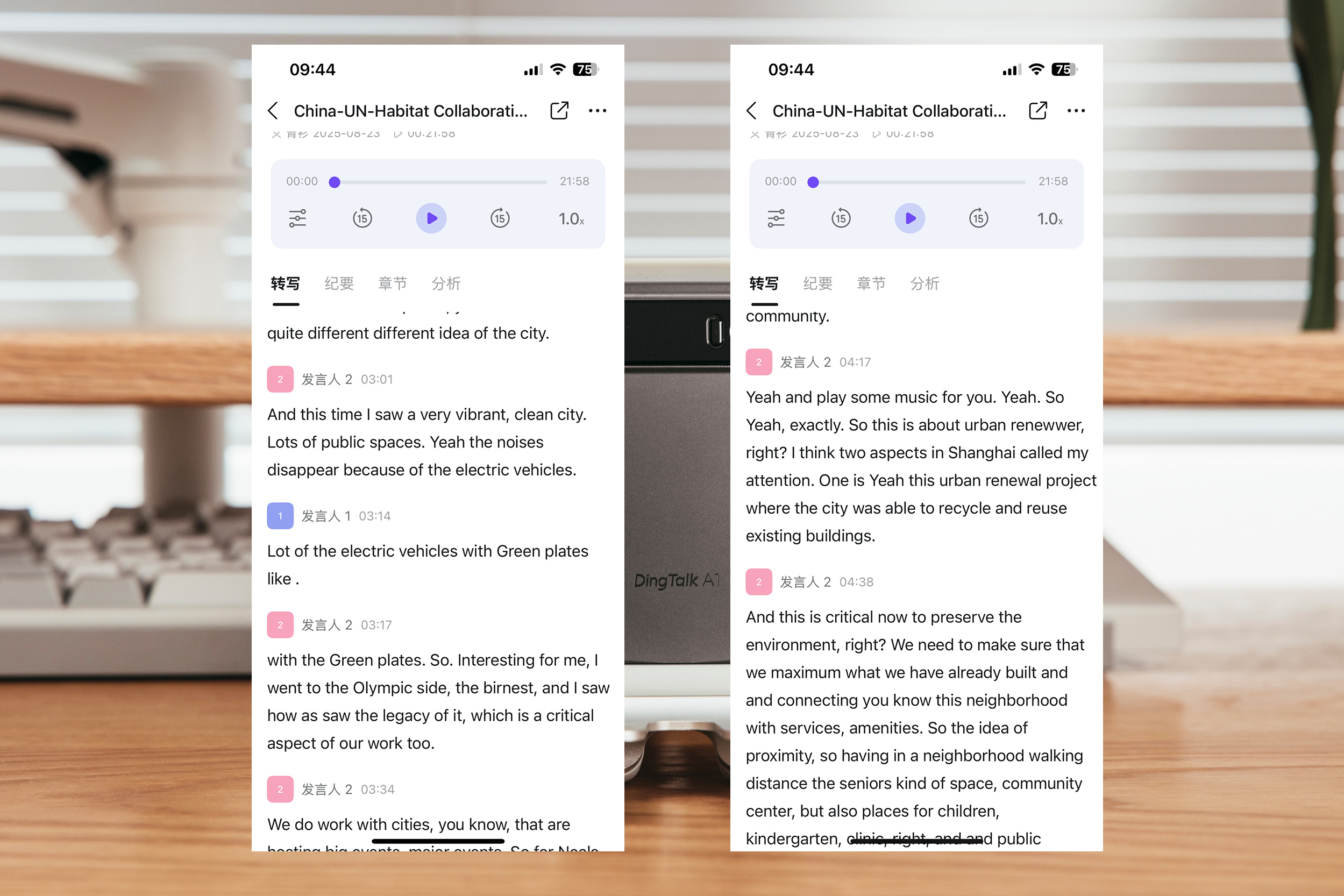 主持人识别为记者(发言人2),访谈中记者并未提及自己名字;而联合国人居署执行主任名字在访谈中提及了,所以DingTalk A1直接识别出来了,但是有一些小问题,识别出来为联合国副秘书长,不过这问题不大,英文翻译基本上都正确。